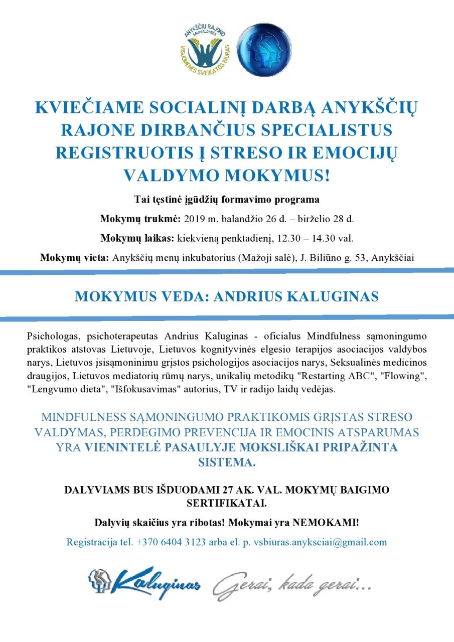 KVIEČIAME SOCIALINĮ DARBĄ ANYKŠČIŲ RAJONE DIRBANČIUS SPECIALISTUS REGISTRUOTIS Į STRESO IR EMOCIJŲ VALDYMO MOKYMUS!