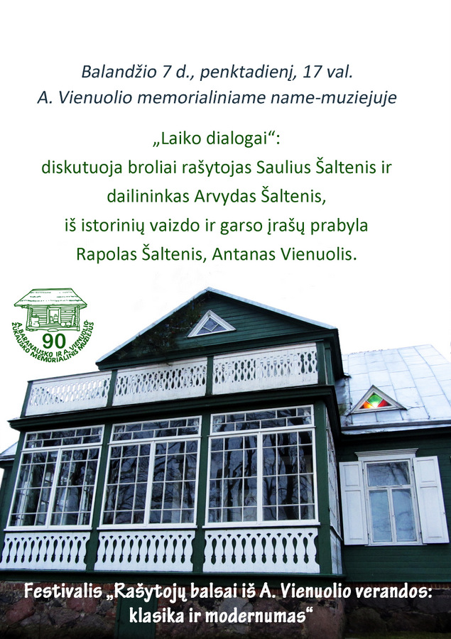 Balandžio 7-ąją, penktadienį, 17 val. festivalio startą rašytojo A. Vienuolio namuose paskelbs pirmieji Muziejaus svečiai – broliai rašytojas Saulius Šaltenis ir dailininkas Arvydas Šaltenis.