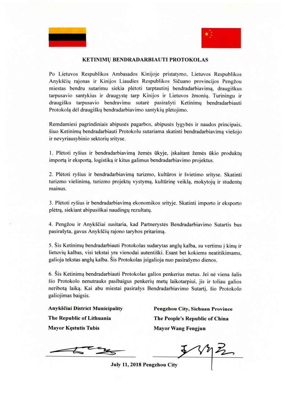 Liepos 11 d. Anykščiams tapo svarbia data. Anykščių rajono meras Kęstutis Tubis abipusiu sutarimu su Kinijos Liaudies Respublikos Sičuano provincijos Pengžou miestu pasirašė Ketinimų Bendradarbiauti Protokolą.