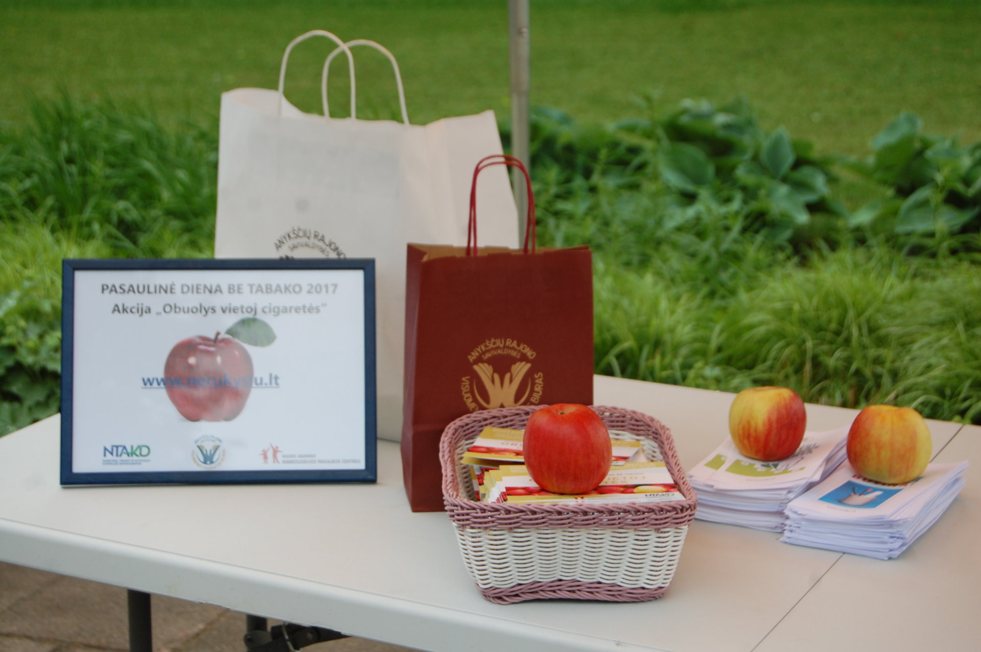 Anykščių rajono savivaldybės visuomenės sveikatos biuras centrinėje miesto aikštėje šią dieną kvietė rajono gyventojus cigaretę iškeisti į obuolį, dalyvauti loterijoje ir laimėti šaunių prizų bei daugiau sužinoti apie būdus, galinčius padėti mesti rūkyti.