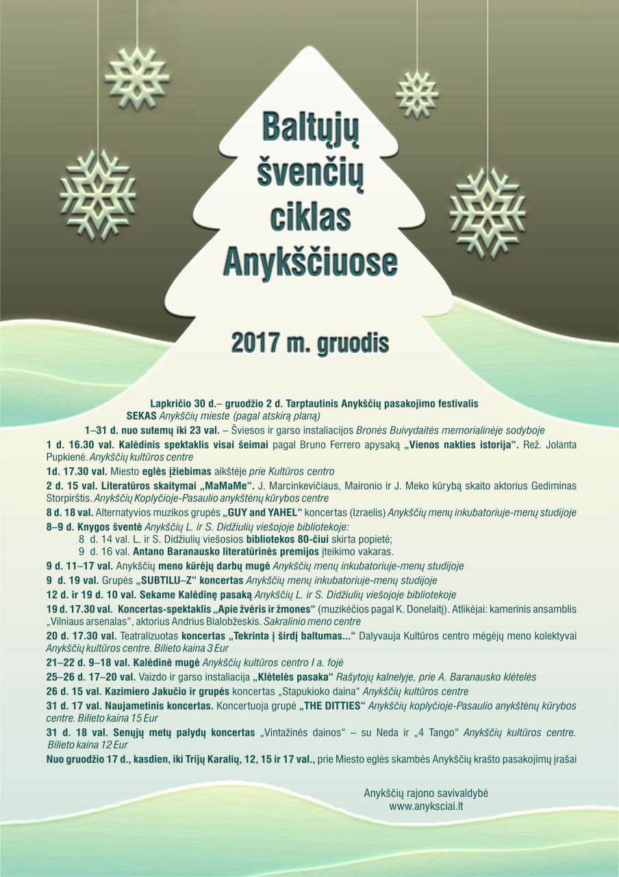 Lapkričio 30 dieną Anykščiuose prasidės net tris dienas truksiantis, pirmą kartą Lietuvoje organizuojamas tarptautinis Anykščių pasakojimo festivalis SEKAS 2017, gruodžio 8–9 d. – Knygos šventė, kurios metu bus minimas Anykščių rajono savivaldybės L. ir S. Didžiulių viešosios bibliotekos 80-metis, taip pat – įteikiama Antano Baranausko literatūrinė premija. Apie gruodžio mėnesį laukiančius renginius Bronės Buivydaitės memorialinėje sodyboje, Anykščių Koplyčioje-Pasaulio anykštėnų kūrybos centre, Sakralinio meno centre, Anykščių menų inkubatoriuje-menų studijoje ir Anykščių kultūros centre daugiau informacijos rasite čia.