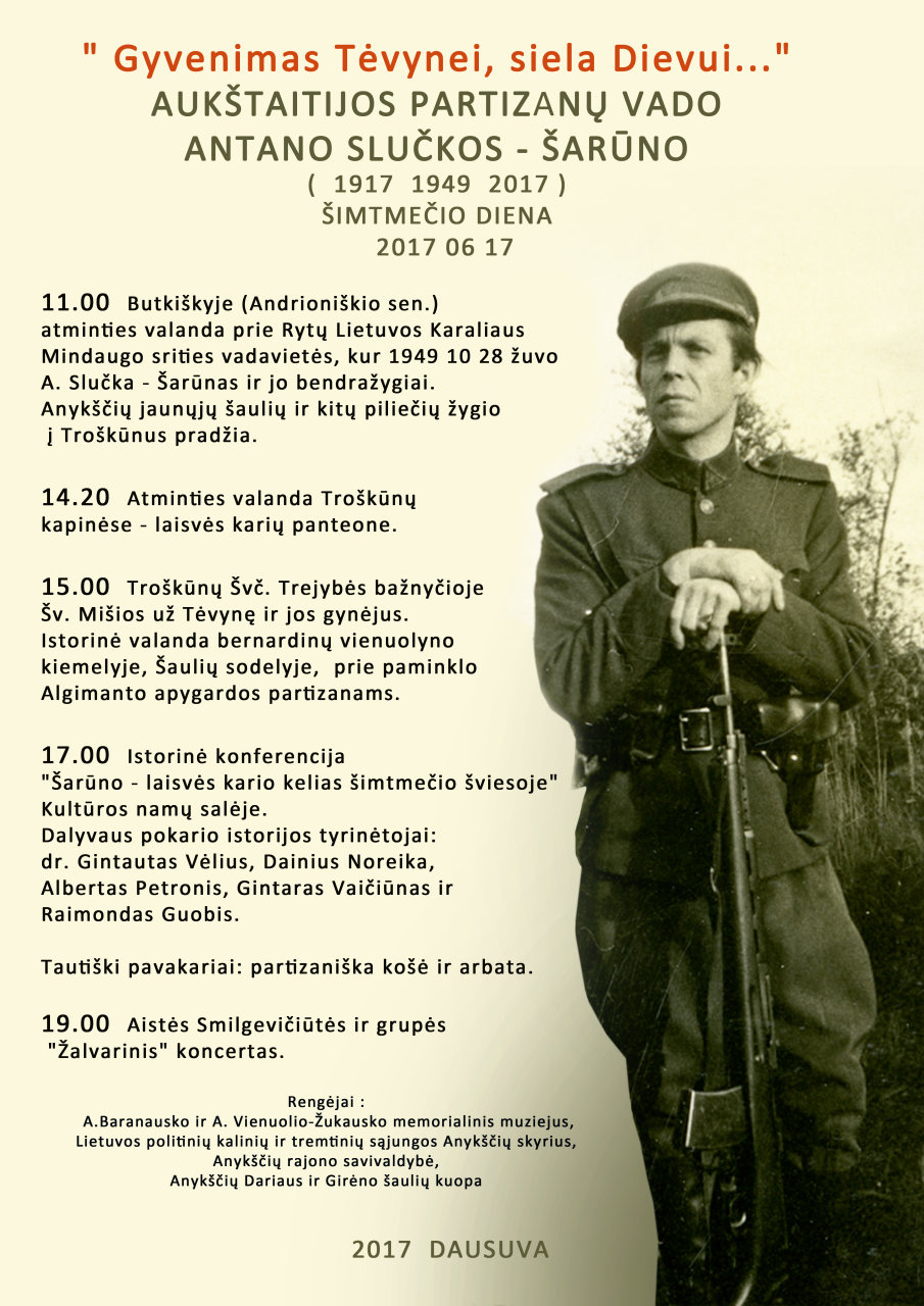Birželio 17-ąją, šeštadienį, Anykščių rajone A. Baranausko ir A. Vienuolio-Žukausko memorialinis muziejus su partneriais rengia Aukštaitijos partizanų vado Antano Slučkos-Šarūno (1917–1949) šimtmečio dieną „Gyvenimas Tėvynei, siela Dievui...“.