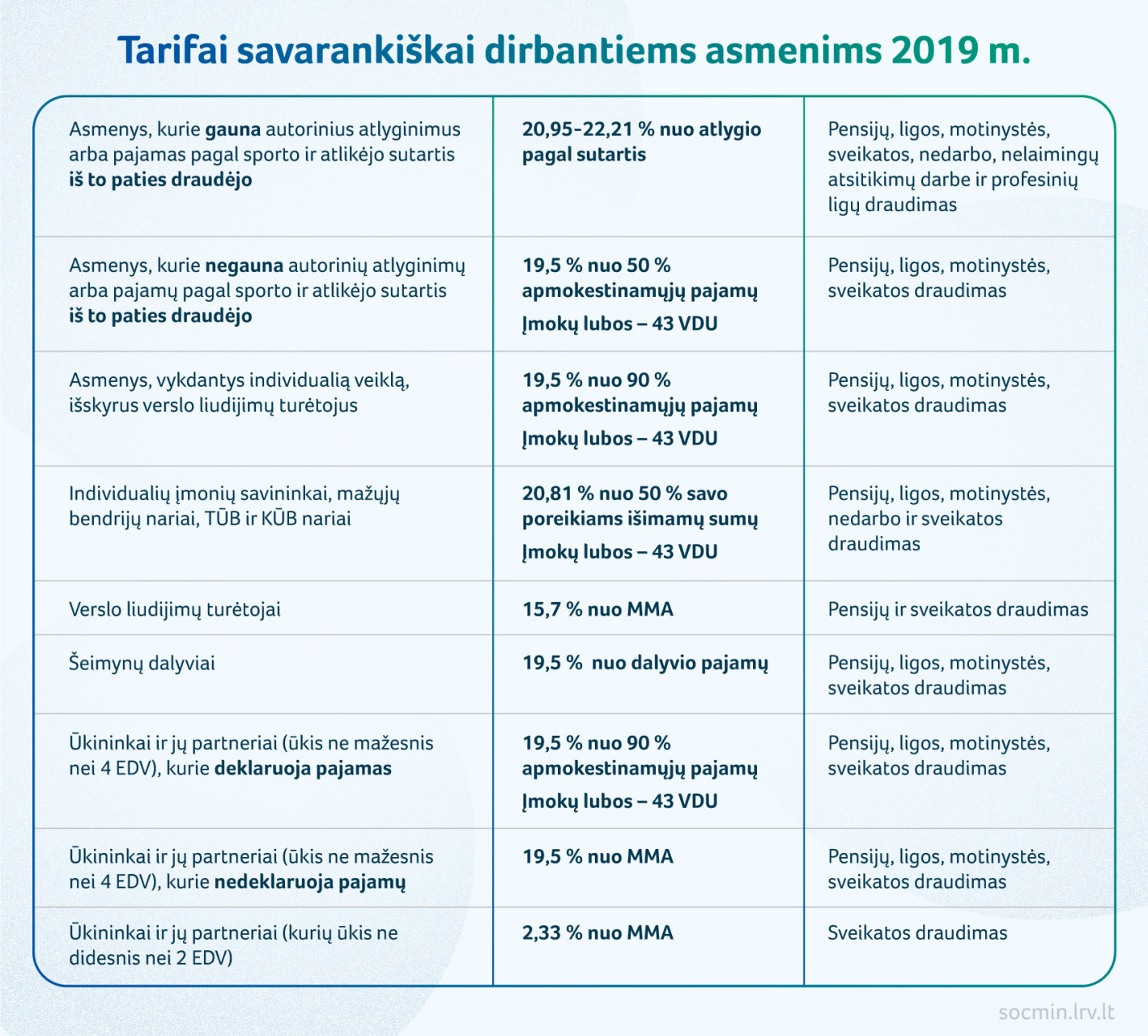 Asmenys, kurie gauna autorinius atlyginimus arba pajamas pagal sporto ir atlikėjo sutartis iš skirtingų darbdavių, individualių įmonių savininkai, mažųjų bendrijų nariai, TŪB ir KŪB nariai įmokas moka nuo 50 proc. apmokestinamųjų pajamų, kaip ir pernai.