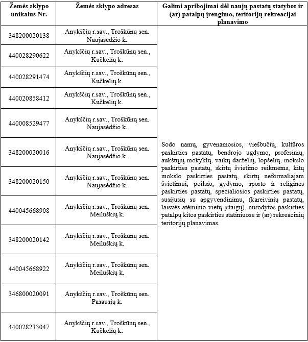 Žemės sklypai, nurodyti žemiau, patenka į teritoriją su statybos apribojimais: