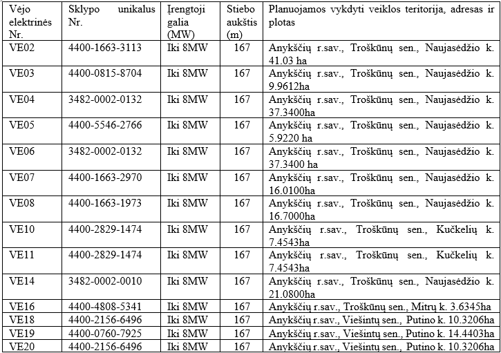 Informuojame, kad UAB „Anykščiai Renew“ įmonės kodas 305894817, adresas Ukmergės g. 219-1, LT-07152 Vilnius) Anykščių r. sav. teritorijoje planuoja statyti didesnės kaip 30 kW įrengtosios galios vėjo elektrines ir užsiimti elektros energijos gamybos vykdymo veikla.