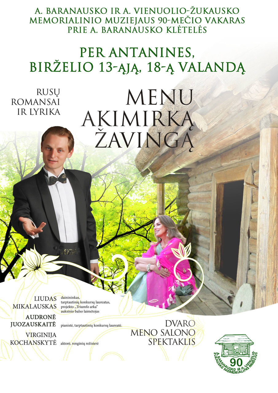 Birželio 13 d., antradienį, 18 val. iškilmingame A. Baranausko ir A. Vienuolio-Žukausko memorialinio muziejaus jubiliejaus vakare prie A. Baranausko klėtelės - Muziejaus įkūrėjo Antano Vienuolio mėgta literatūros ir muzikos programa „Menu akimirką žavingą“, kurią šventės dalyviams pateiks solistas, projekto „Triumfo arka“ auksinio balso laimėtojas ir tarptautinių konkursų laureatas Liudas Mikalauskas, aktorė, renginių režisierė Virginija Kochanskytė ir pianistė, tarptautinių konkursų laureatė Audronė Juozauskaitė.