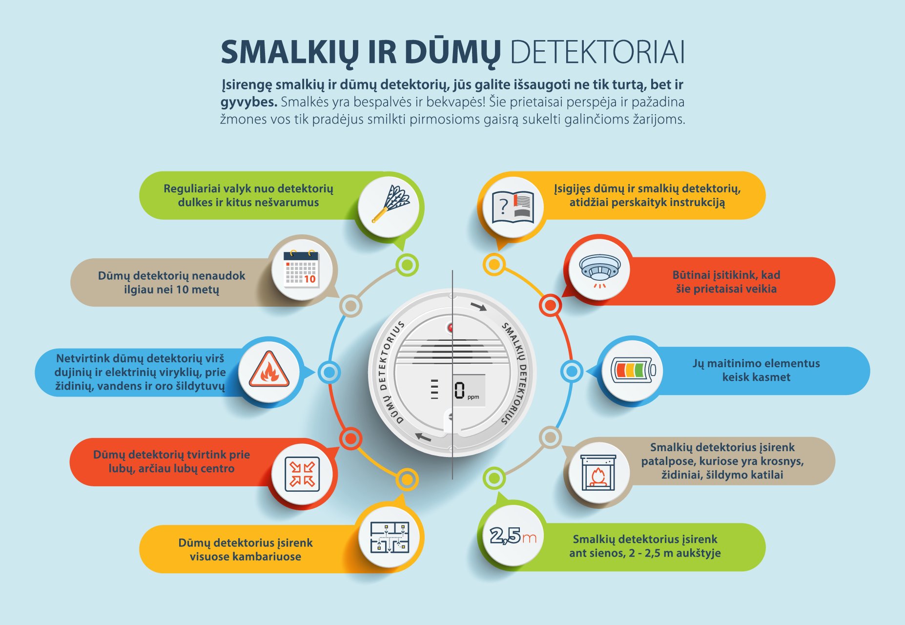 Priešgaisrinės apsaugos ir gelbėjimo departamentas informuoja, jog nuo šių metų gegužės 1 d., įsigaliojus Bendrųjų gaisrinės saugos taisyklių pakeitimams, visuose būstuose gyventojai privalės įsirengti autonominius dūmų detektorius. Kasmet Lietuvoje gaisruose žūsta daugiau kaip 100 žmonių. Šiemet ugnis jau pražudė 49 žmones. Kad tokių nelaimių būtų mažiau, viena efektyviausių priemonių yra autonominis dūmų detektorius. Kai patalpoje atsiranda dūmų, šie prietaisai garsiu signalu perspėja žmones apie kilusį gaisrą. Pernai šalyje, suveikus dūmų detektoriams, buvo išgelbėta ne viena gyvybė. Neretai gaisrai kyla naktį, tad, turint šį prietaisą namuose, šaižus jo garsas prikelia iš miego ir tragedijos dažniausiai pavyksta išvengti.