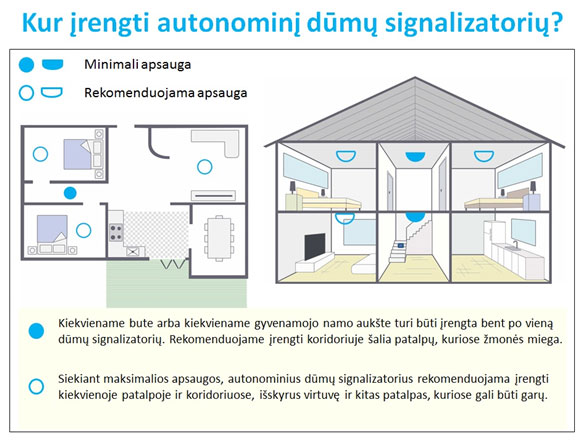 Dūmų detektoriai turi būti tvirtinami ant lubų patalpose, kuriose žmonės miega, arba koridoriuje šalia miegamojo. Didelių būstų savininkai turėtų įsigyti kelis dūmų detektorius. Juos reikėtų tvirtinti toliau nuo vonios, virtuvės bei langų. Pastatą palikti reikia vos išgirdus dūmų detektoriaus signalą. Ir nedelsiant kviesti ugniagesius skubios pagalbos telefonu 112.