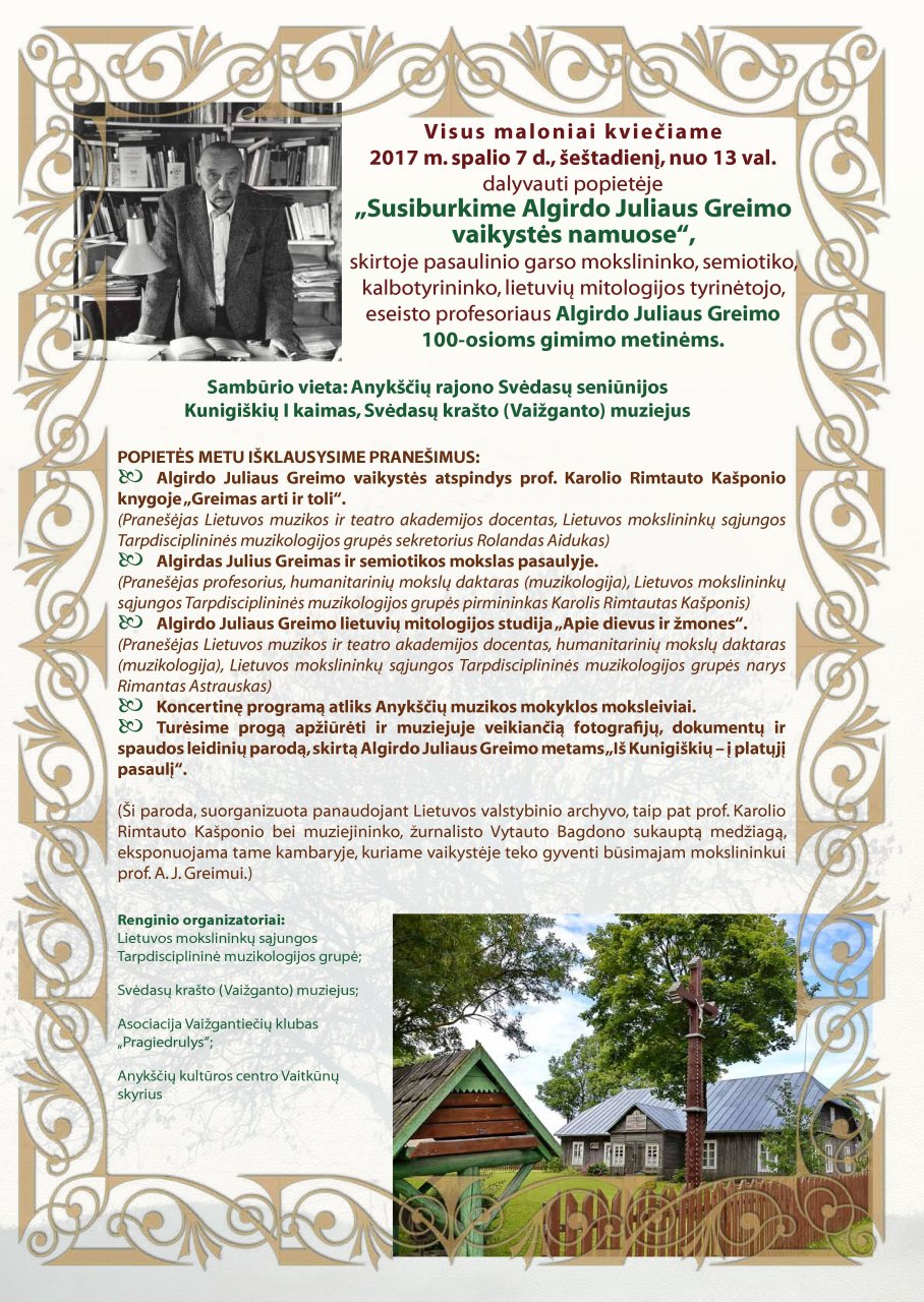 Visus maloniai kviečiame 2017 m. spalio 7 d., šeštadienį, nuo 13 val. dalyvauti popietėje „Susiburkime Algirdo Juliaus Greimo vaikystės namuose“, skirtoje pasaulinio garso mokslininko, semiotiko, kalbotyrininko, lietuvių mitologijos tyrinėtojo, eseisto profesoriaus Algirdo Juliaus Greimo 100-osioms gimimo metinėms.