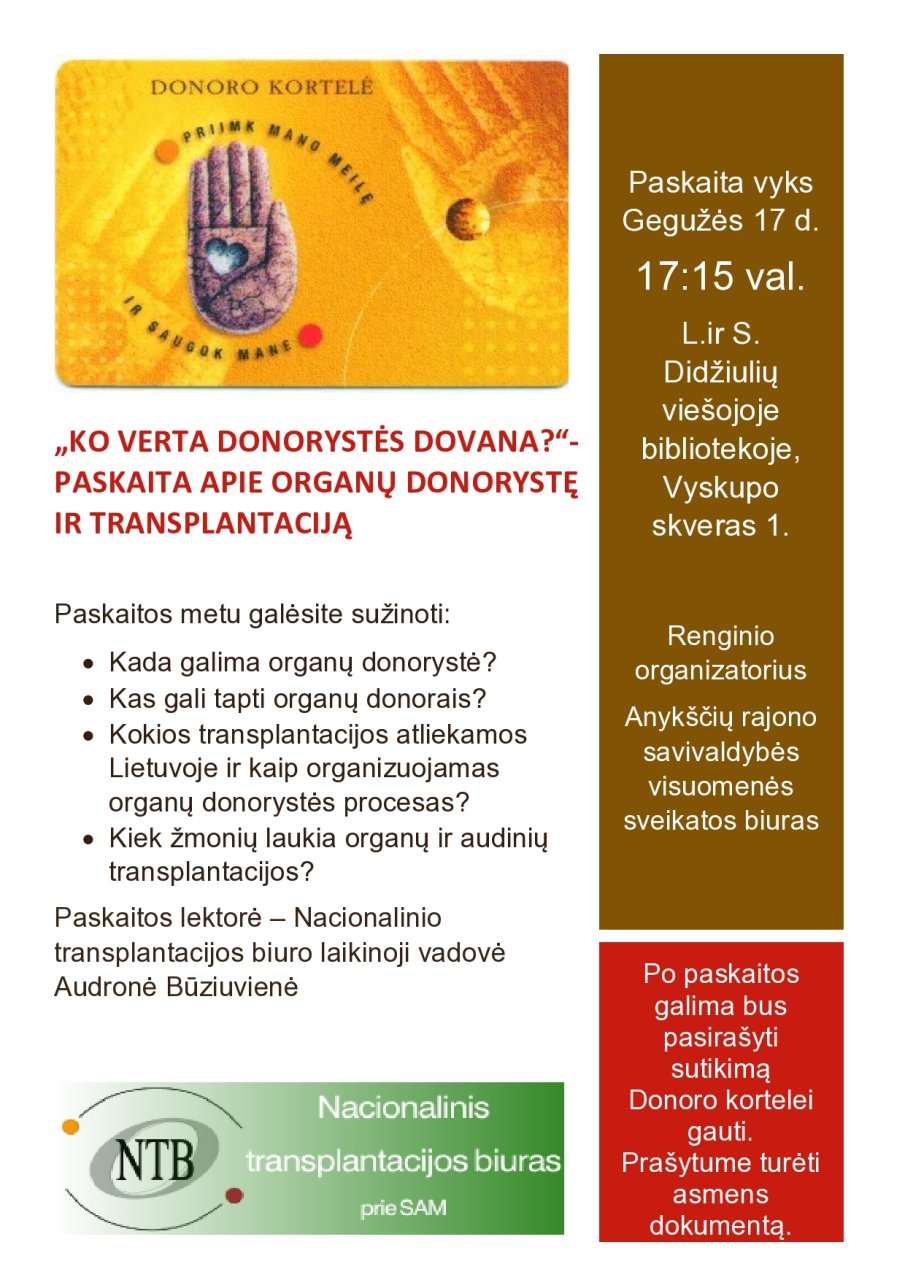 Po paskaitos bus galimybė pasirašyti sutikimą Donoro kortelei gauti. Prašytume turėti asmens dokumentą.
