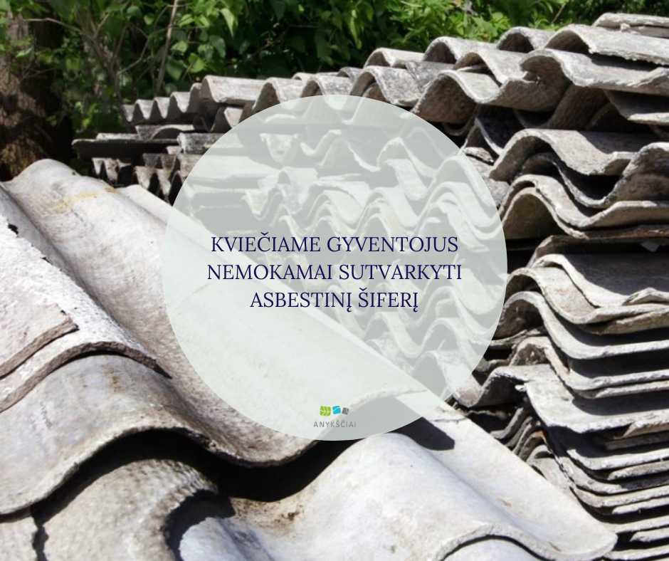 Primename, Anykščių rajono savivaldybės administracija kviečia gyventojus nemokamai sutvarkyti asbestinį šiferį. Nuo šių metų birželio 3 d. 8.00 val. norinčius pasinaudoti minėta galimybe, kviečiame savivaldybės administracijai pateikti laisvos formos prašymą, nurodant vardą, pavardę, kontaktinį telefono numerį bei adresą, iš kur reikės paimti asbestinį šiferį bei asbesto preliminarų kiekį (1 m2 ~ 11 kg). Maksimalus iš vienos valdos išvežamų asbesto šiferio atliekų kiekis 3 tonos. Užpildytus prašymus prašome pristatyti adresu J. Biliūno g. 23, Anykščiai arba siųsti el. paštu info@anyksciai.lt. Anksčiau pateikti prašymai nebus registruojami.