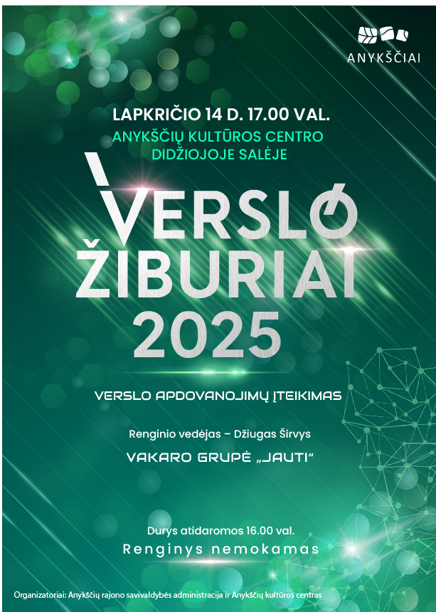 Kviečiame lapkričio 14 d., 17 val., atvykti į Anykščių Kultūros centro Didžiąją salę ir kartu pasidžiaugti verslo pasiekimais.