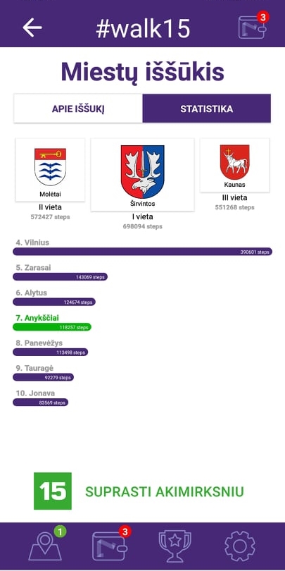 Vakar programėlėje startavo naujas iššūkis „#walk15 Miestų iššūkis”, kurio idėja nueiti kuo daugiau žingsnių už savo miestą.