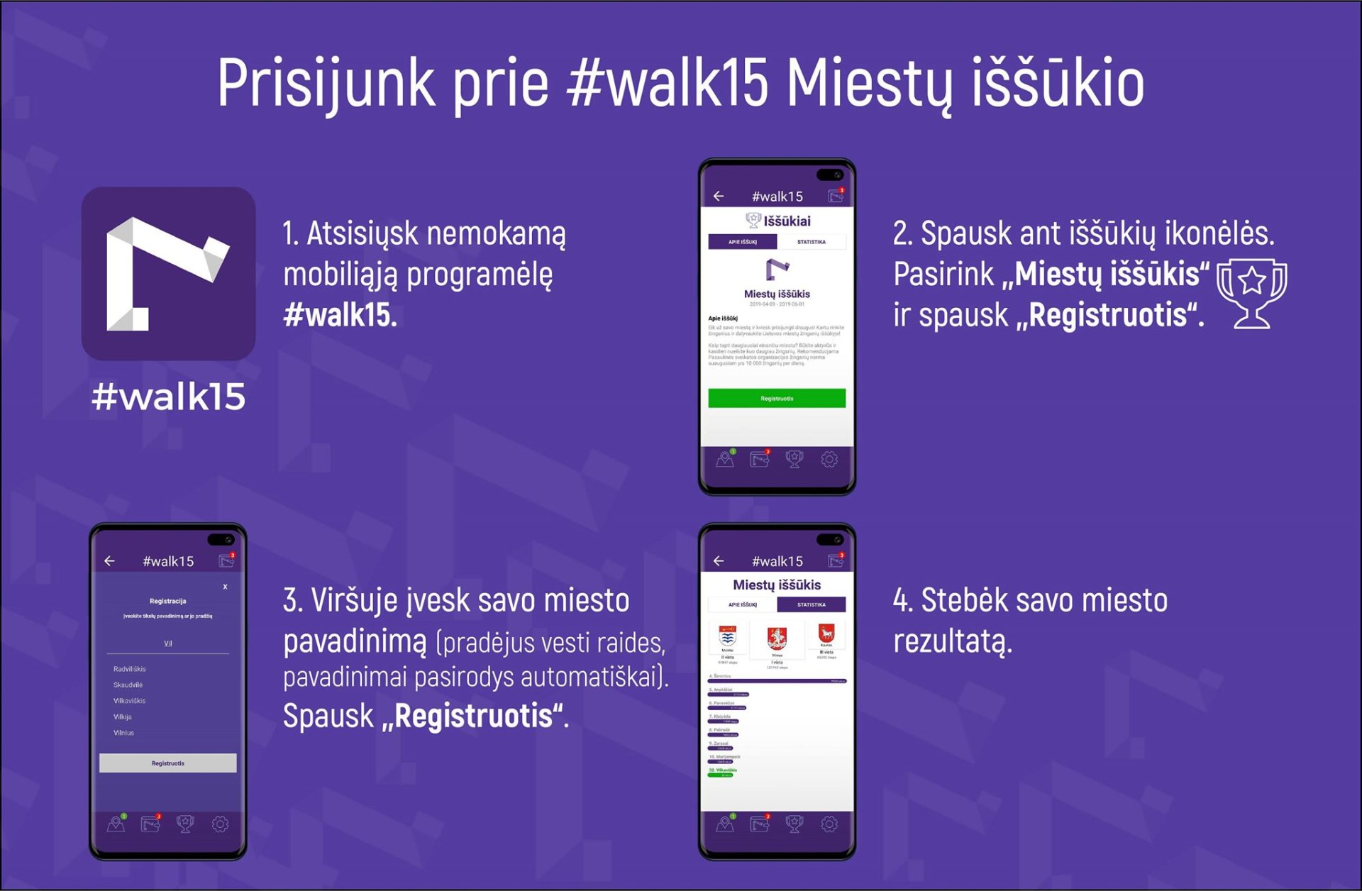 Sėkmingai startavusi mobili žingsnių skaičiavimo programėlė #walk15 kuria iššūkius jos vartotojams. Programėlės #walk15 tikslas – skatinti vaikščiojimą, už nueitus žingsnius gauti taškus ir juos iškeisti į nuolaidas tam tikroms prekėms ar paslaugoms.