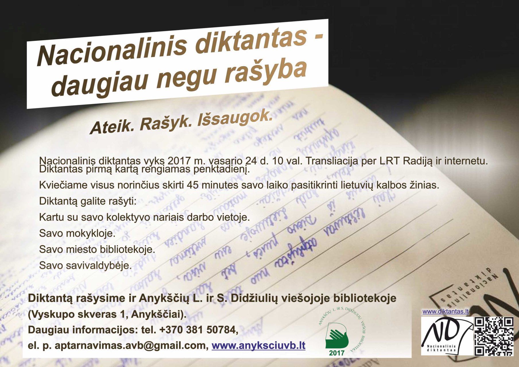 VšĮ Pilietinės minties instituto organizuojamas Nacionalinis diktantas vyks vasario 24 dieną 10 valandą. Diktantas bus transliuojamas per LRT radiją.