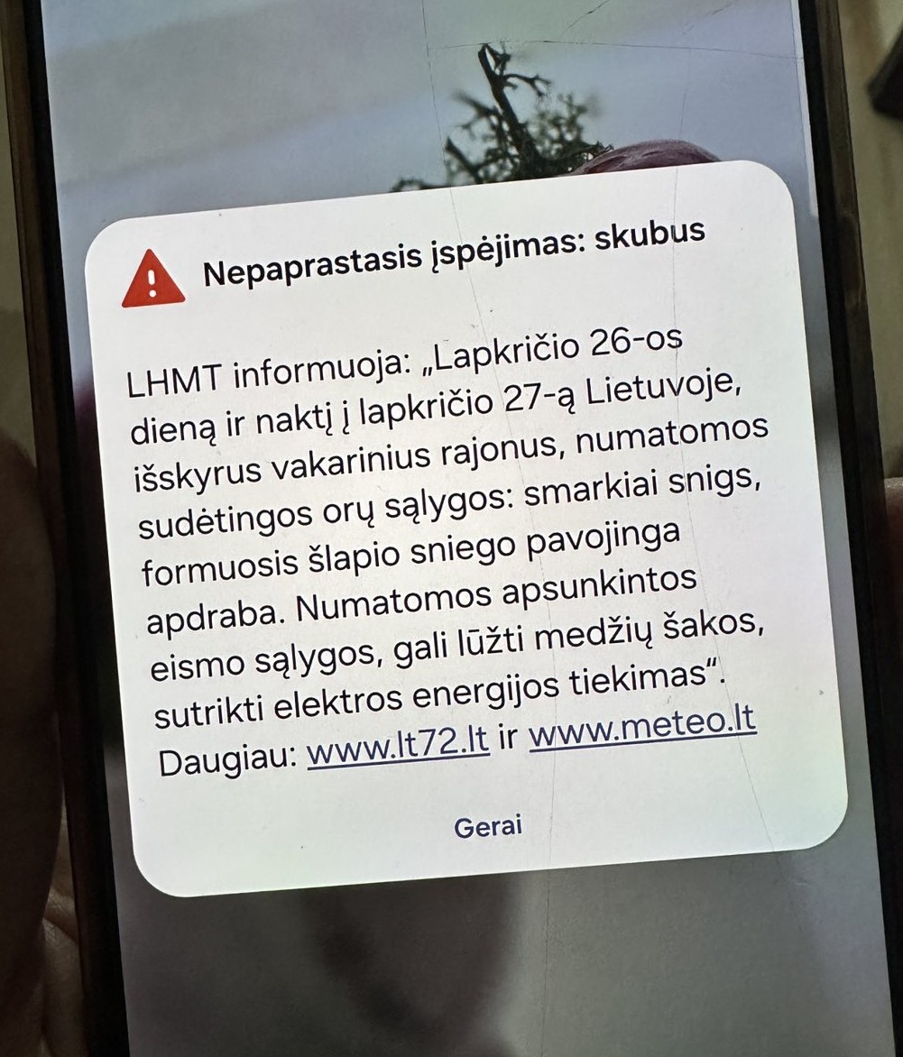 Lapkričio 26 d. 8–12 val. laikotarpiu pietiniuose Lietuvos rajonuose bus pasiektas žiemos reiškinių komplekso - smarkaus sniego ir šlapio sniego apdrabos - rodiklis. Antroje lapkričio 26-os dienos pusėje ir naktį į lapkričio 27-ą, žiemos reiškinių kompleksas išplis į daugelį šalies rajonų.Iki ketvirtadienio ryto dalyje šalies gali susiformuoti iki 15–20 cm siekianti sniego danga.
