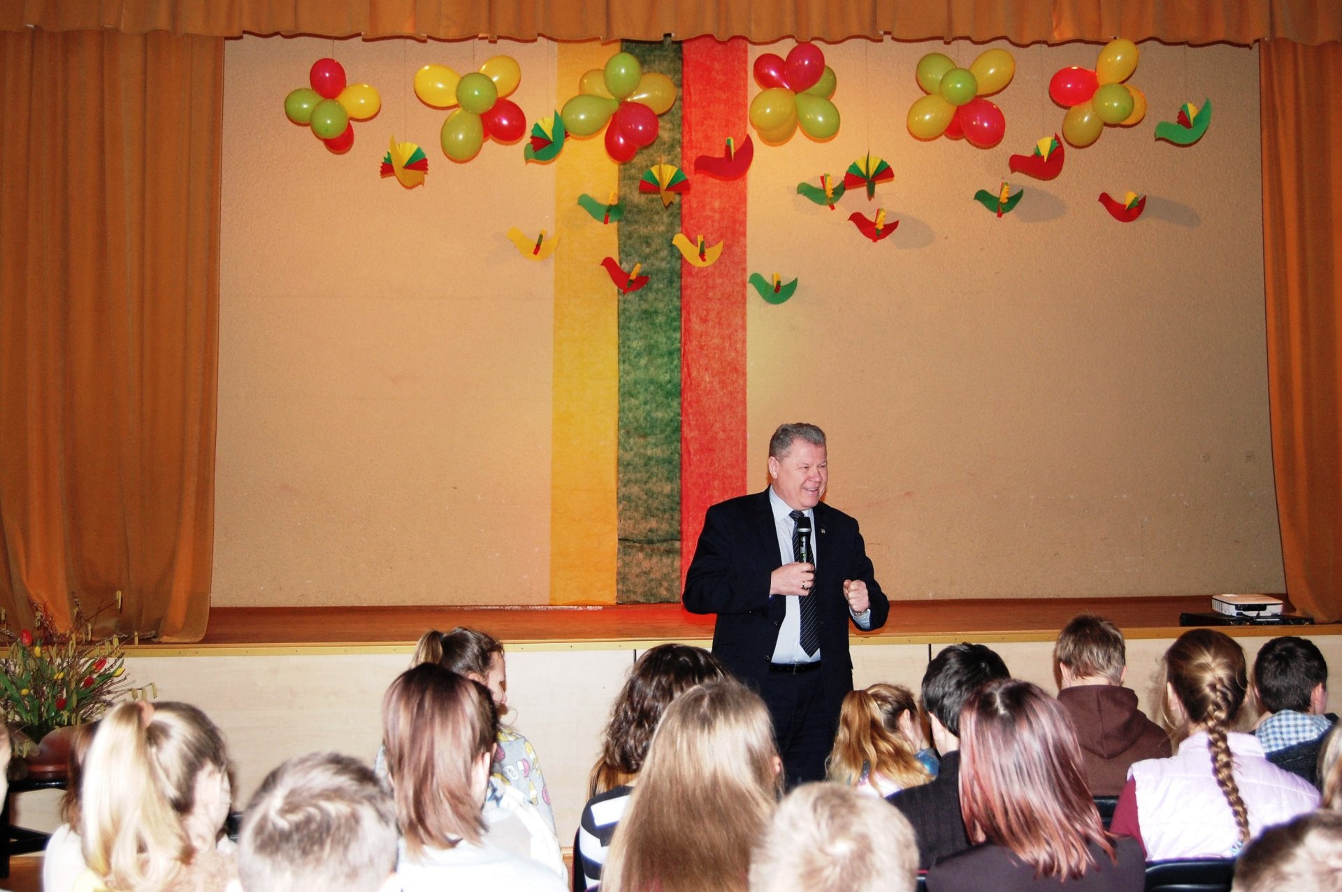 Rajono meras progimnazijos auklėtinius ir jų mokytojus taip pat pasveikino su artėjančia Lietuvos Nepriklausomybės atkūrimo diena, palinkėjo visada išlikti teisingais ir nebijoti sakyti tiesos.