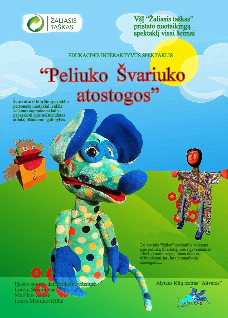 Alytaus lėlių teatras „Aitvaras“ ir pakuočių atliekų tvarkymo organizacija Lietuvoje „Žaliasis taškas“ pristato spektaklį ikimokyklinio ir pradinio ugdymo vaikams „Peliuko Švariuko atostogos“, kurio tikslas – per įsimintinų personažų nuotykius papasakoti vaikams apie aplinkosaugą, sukurti tvarų santykį su daiktais ir suprantama kalba papasakoti apie neišnaudotas atliekų rūšiavimo galimybes.