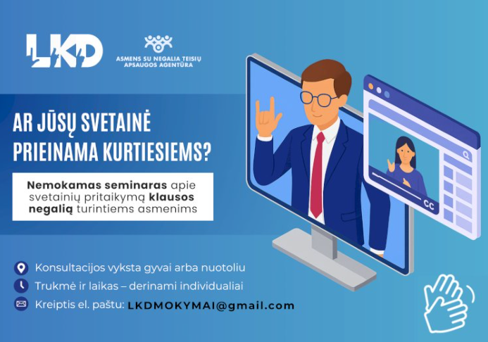 Lietuvos kurčiųjų draugija (LKD), siekdama skatinti informacinės aplinkos ir komunikacijos prieinamumą kurtiesiems bei neprigirdintiesiems, kviečia organizacijas ir įmones į nemokamas konsultacijas.