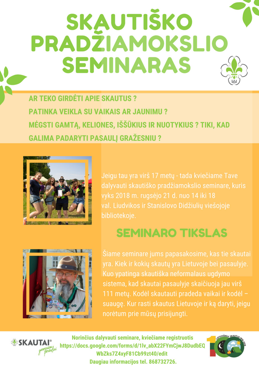 Jeigu tau yra virš 17 metų - tada kviečiame Tave dalyvauti skautiško pradžiamokslio seminare, kuris vyks 2018 m. rugsėjo 21. nuo 14 iki 18val. Liudvikos ir Stanislovo Didžiulių viešojoje bibliotekoje.