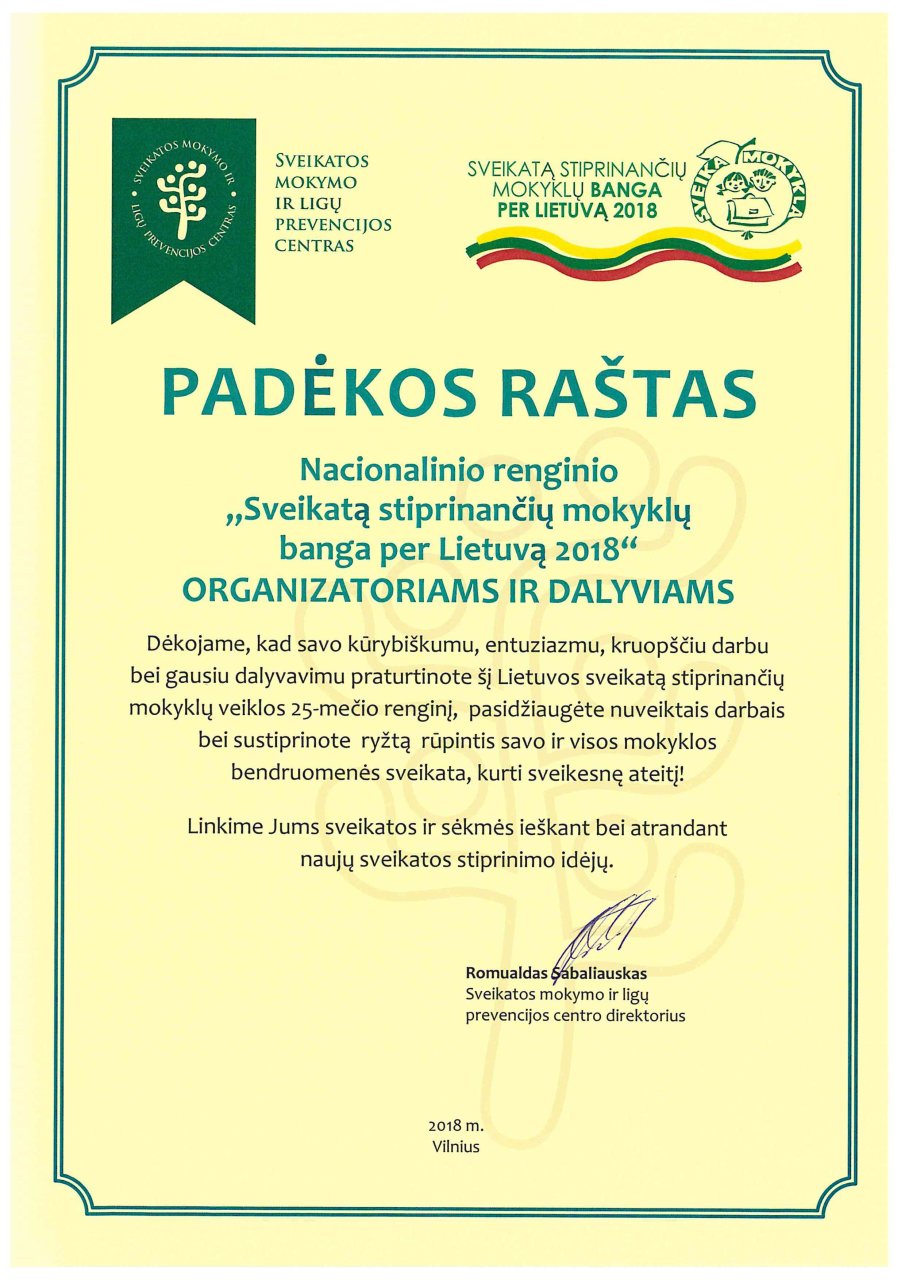 Nuvilnijus Nacionaliniam renginiui „Sveikatą stiprinančių mokyklų banga per Lietuvą 2018“, kuriame dalyvavo Anykščių r. šešios švietimo įstaigos (A. Baranausko pagrindinė mokykla, Debeikių pagrindinė mokykla, Troškūnų K. Inčiūros gimnazija, l-d „Eglutė“, l-d „Spindulėlis“, l-d „Žiogelis“) renginio organizatoriai ir dalyviai įvertinti Sveikatos mokymo ir ligų prevencijos centro direktoriaus padėkos raštu, Anykščių savivaldybės mero Kęstučio Tubio padėkos mokykloms skirtos už sveikatą stiprinančių mokyklų idėjų sklaidą, indėlį į bendruomenės sveikatos stiprinimą.