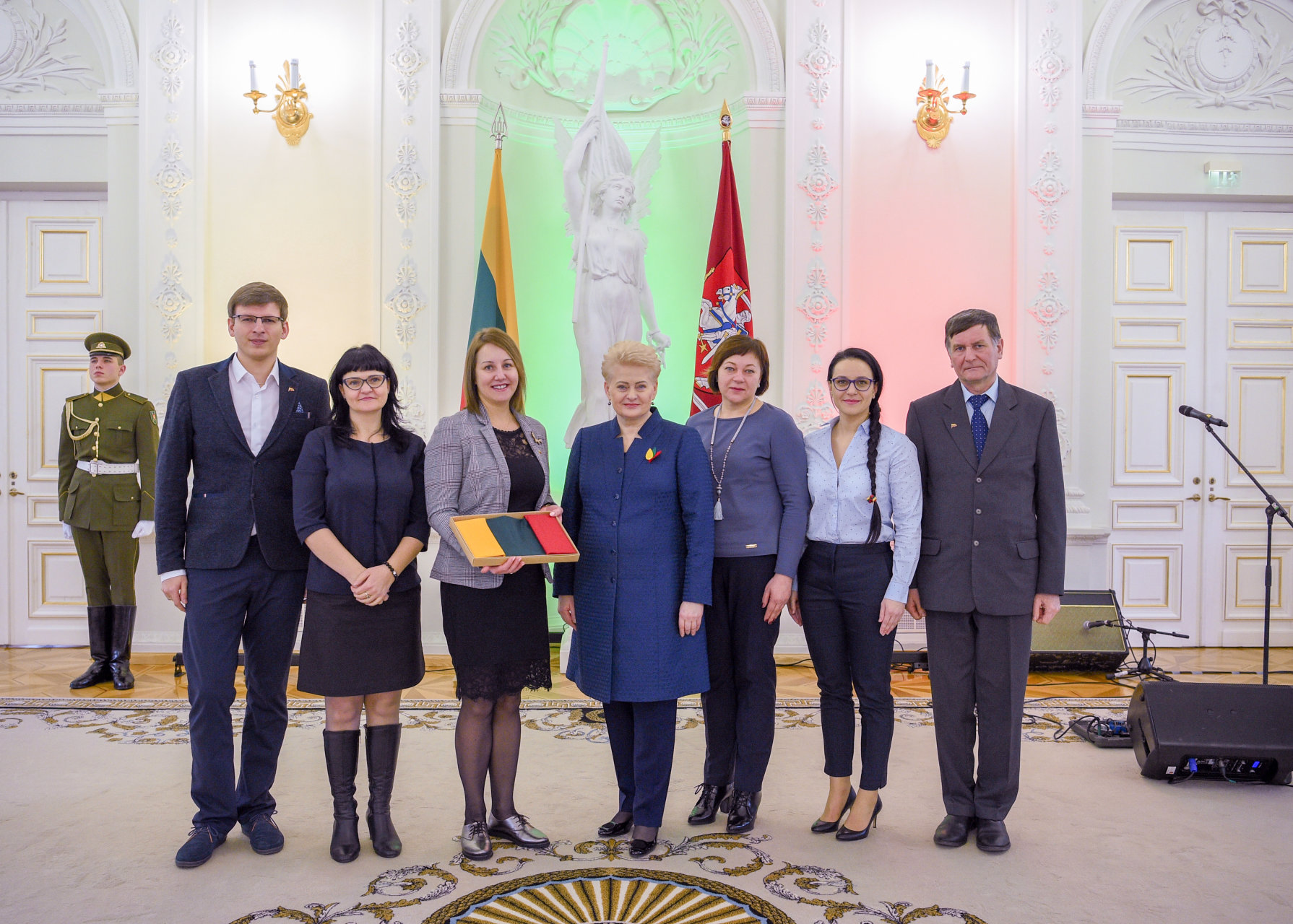 Šiandien Lietuvos Respublikos Prezidentė Dalia Grybauskaitė pasveikino ir už originalumą, pilietiškumą, gebėjimą sutelkti bei meilės Tėvynei puoselėjimą Lietuvos valstybės vėliavomis apdovanojo sumaniausius akcijos „Vasario 16-ąją švęsk linksmai ir išradingai“ idėjų iniciatorius.