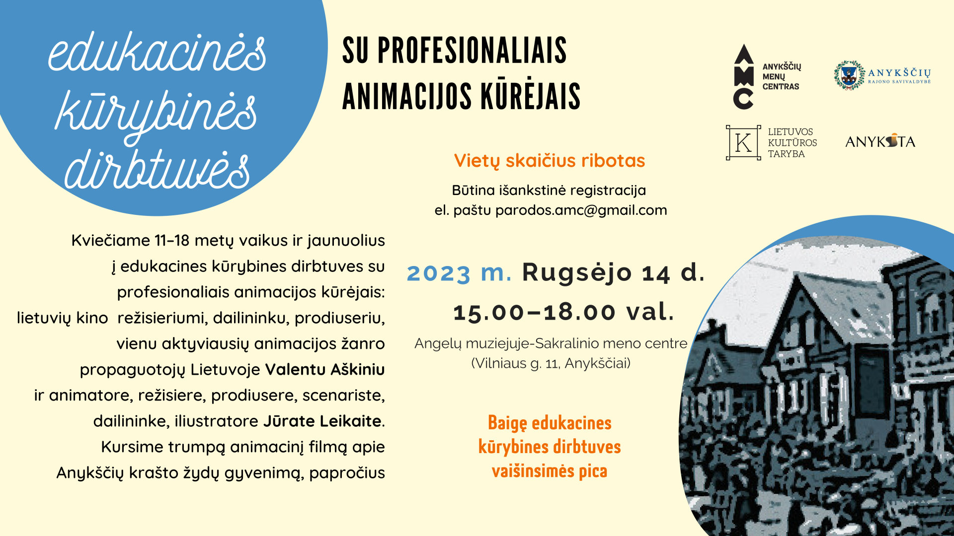 Kviečiame 11–18 metų vaikus ir jaunuolius į edukacines kūrybines dirbtuves su profesionaliais animacijos kūrėjais: lietuvių kino režisieriumi, dailininku, prodiuseriu, vienu aktyviausių animacijos žanro propaguotojų Lietuvoje Valentu Aškiniu ir animatore, režisiere, prodiusere, scenariste, dailininke, iliustratore Jūrate Leikaite.Kursime trumpą animacinį filmą apie Anykščių krašto žydų gyvenimą, papročius.
