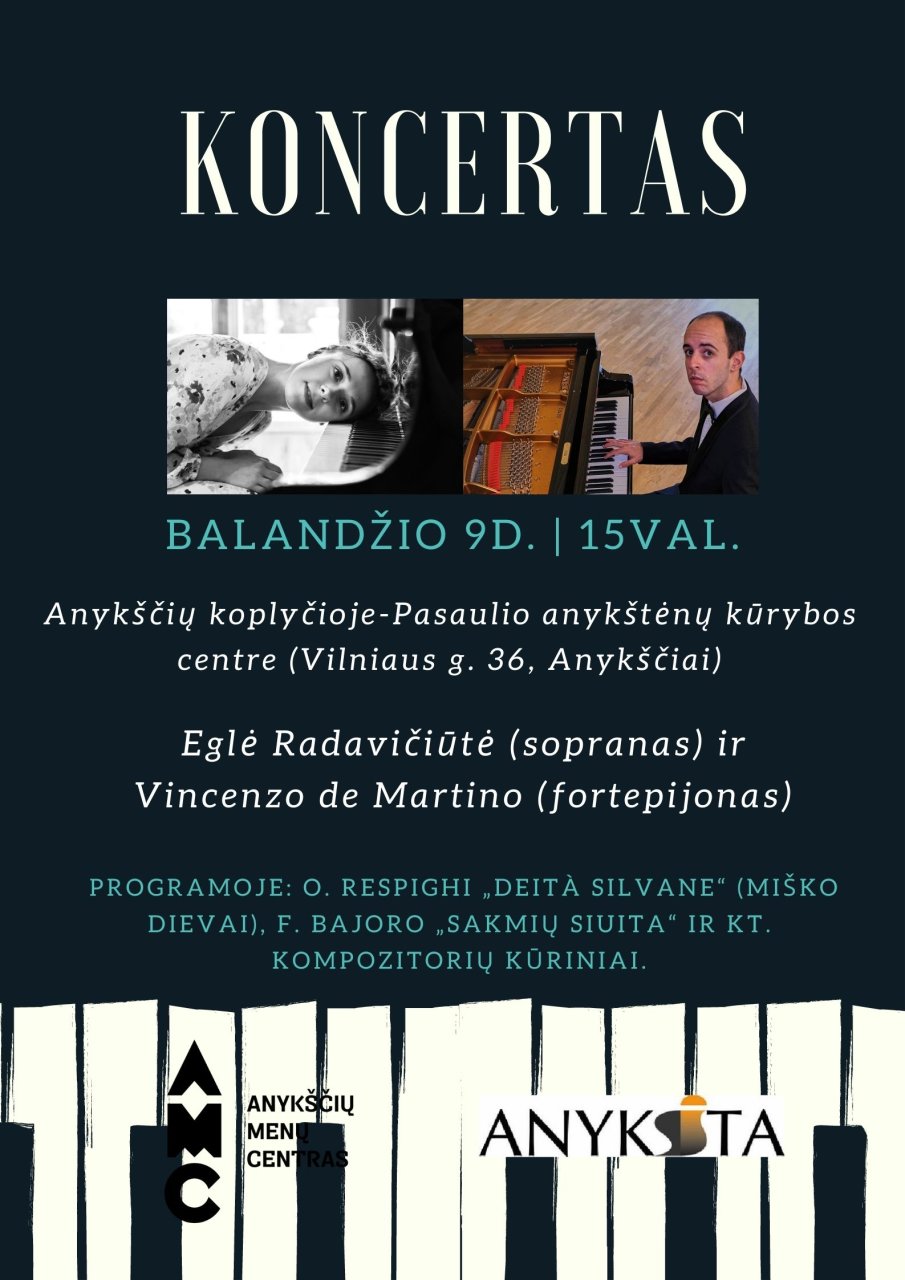 Balandžio 9 d., šeštadienį, 15 val. Eglės Radavičiūtės (sopranas) ir Vincenzo de Martino (fortepijonas) koncertas Koplyčioje – Pasaulio anykštėnų kūrybos centre (Vilniaus g. 36, Anykščiai).