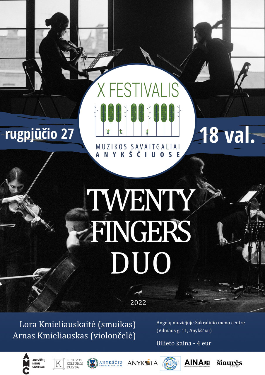 Rugpjūčio 27 dieną, šeštadienį, 18.00 val. Angelų muziejuje-Sakralinio meno centre (Vilniaus g. 11) skambės dar vienas festivalio „Muzikos savaitgaliai Anykščiuose“ koncertas. Šįkart svečiuose – „TWENTY FINGERS DUO“. Brolio ir sesers , Arno Kmieliausko (violančelė) ir Loros Kmieliauskaitės (smuikas), duetas kviečia į elektroakustinės muzikos koncertą „DUALITAS“. Bilieto kaina 4 eur