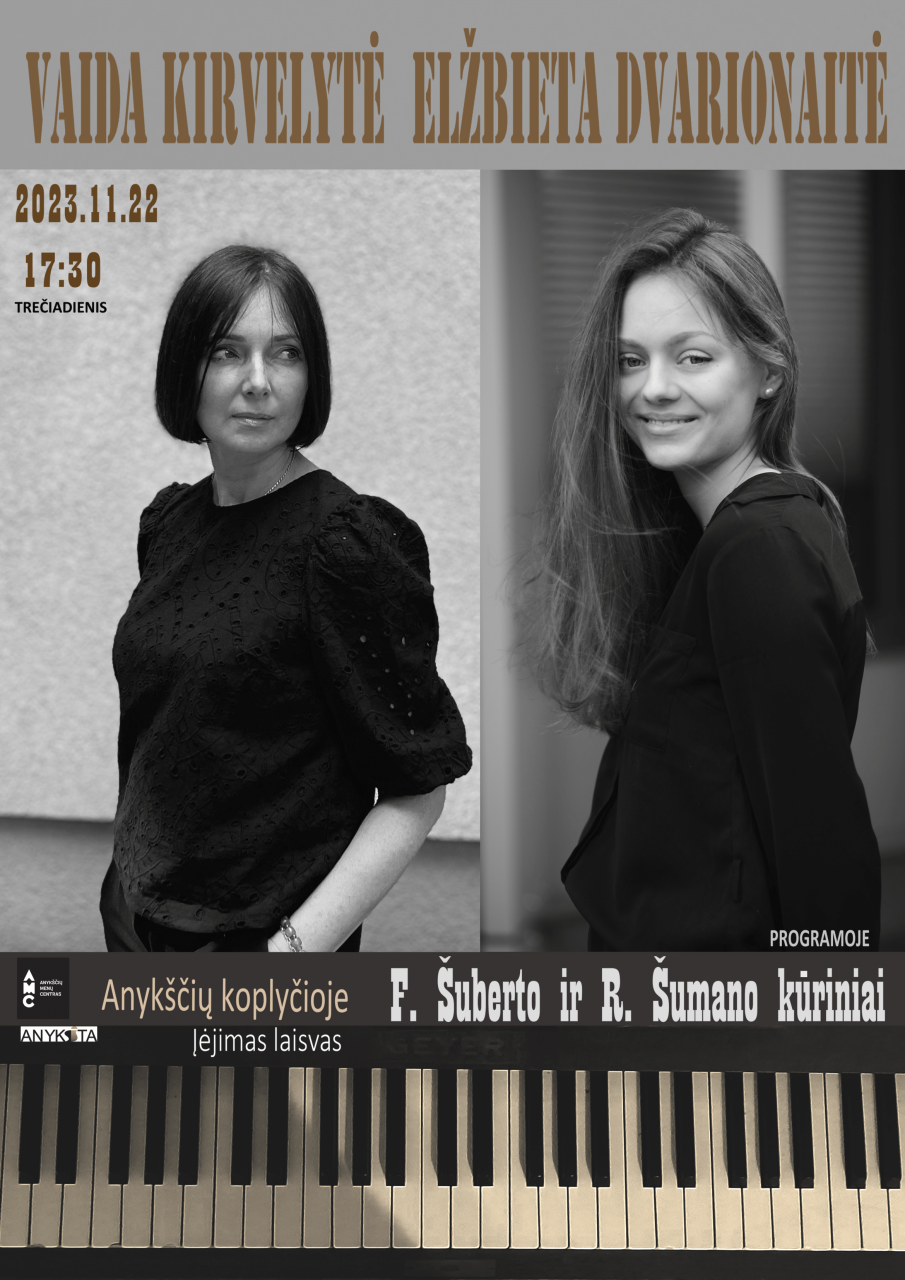 Koncerto metu, Vaida Kirvelytė (fortepijonas) ir Elžbieta Liepa Dvarionaitė (fortepijonas) klausytojus džiugins F. Šuberto ir R. Šumano kūriniais.