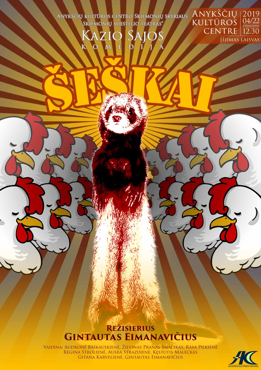 AKC Skiemonių skyriaus „Skiemonių miestelio teatras“ anykštėnus ir miesto svečius maloniai kviečia į K. Sajos komediją „Šeškai“. Režisierius Gintautas Eimanavičius. Vaidina: Audronė Baškauskienė, Žilvinas Pranas Smalskas, Rasa Pilkienė, Regina Strolienė, Aušra Strazdienė, Kęstutis Maleckas, Gitana Karvelienė, Gintautas Eimanavičius.