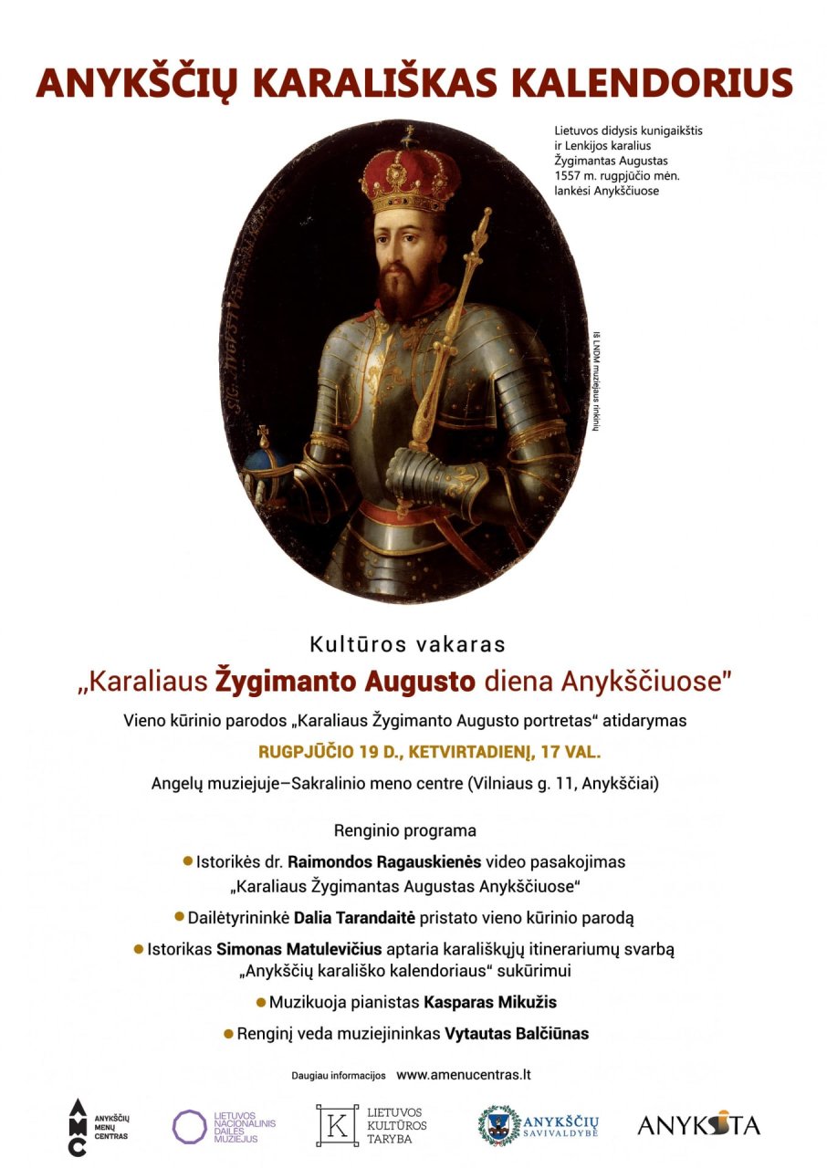 Rugpjūčio 19 d., ketvirtadienį, 17 val. Angelų muziejuje–Sakralinio meno centre (Vilniaus g. 11, Anykščiai) – vieno kūrinio parodos „Karaliaus Žygimanto Augusto portretas“ atidarymas. ![]()