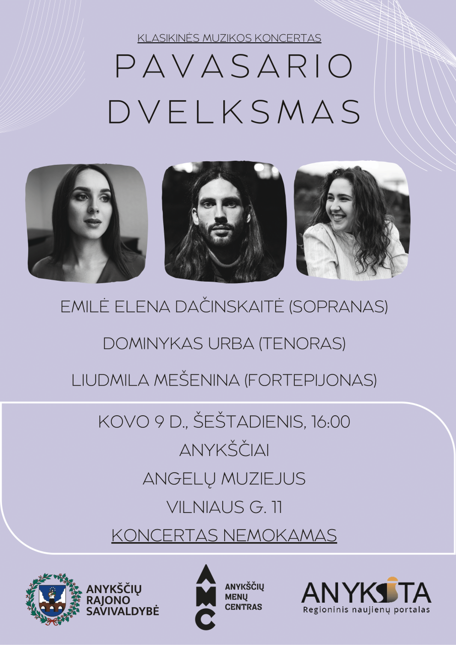 Maloniai kviečiame į nemokamą koncertą „Pavasario dvelksmas“, vyksiantį Angelų muziejuje-Sakralinio meno centre (Vilniaus g. 11, Anykščiai) kovo 9 d. 16.00 val.