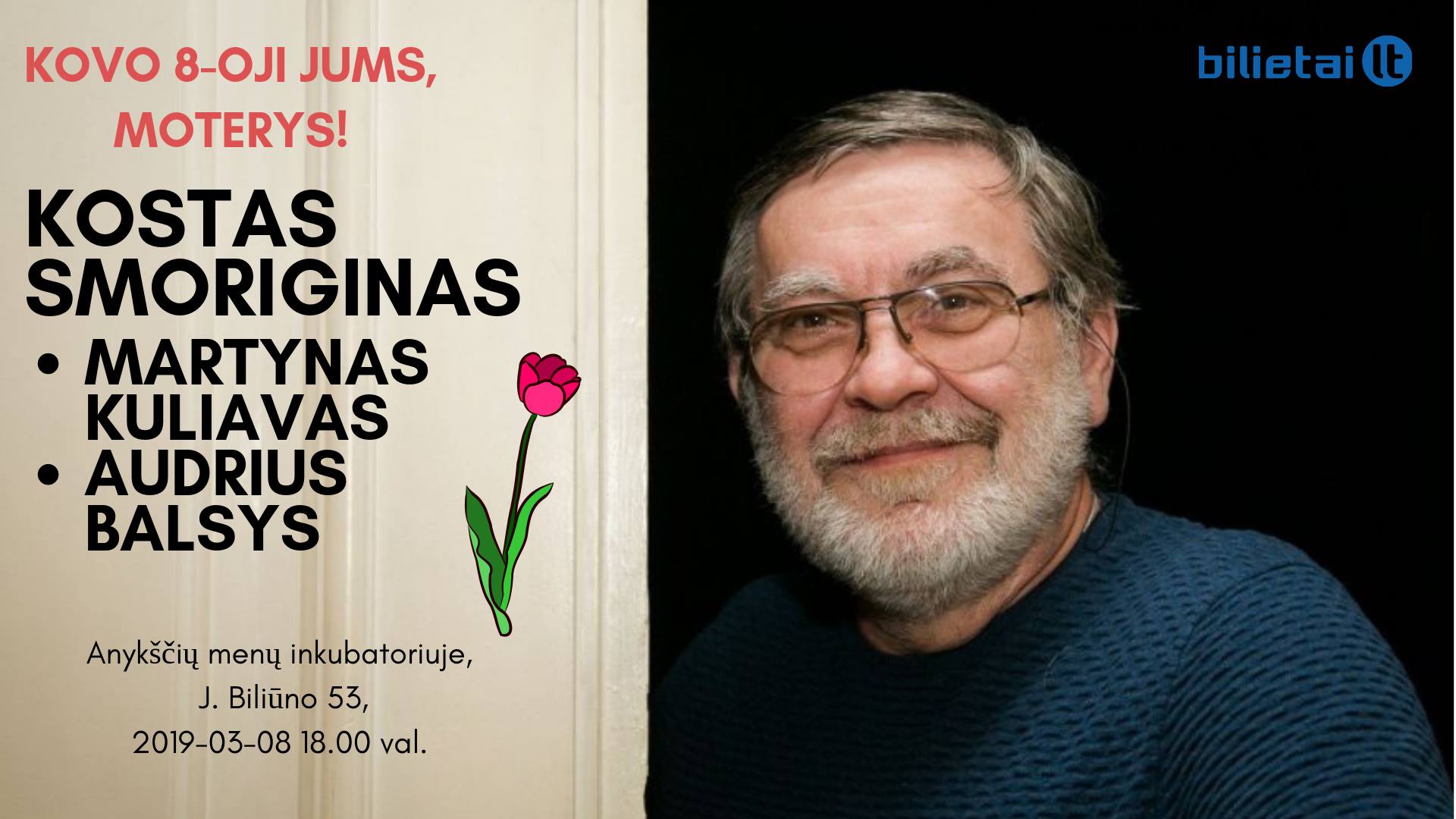 Į Anykščių meno inkubatoriaus sceną sugrįžta Kostas Smoriginas ir surengs išskirtinį koncertą moterims! Kostas Smoriginas – teatro ir kino aktorius, režisierius, dainų autorius ir atlikėjas, o taip pat ir nacionalinės kultūros ir meno premijos laureatas. Programoje visiems gerai pažįstami ir nauji kūriniai, dedikuoti specialiai moterims ir jų vyrams.