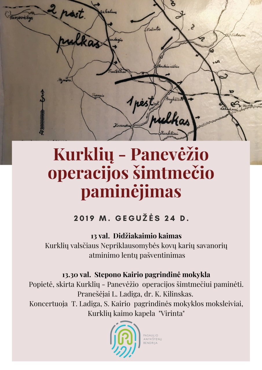 Kurklių miestelio ir viso Anykščių rajono gyventojus kviečiame paminėti šį svarbų įvykį - gegužės 24 d. 13 val. rinksimės Didžiakaimio kaime, kur bus šventinamos Kurklių valsčiaus Nepriklausomybės kovų karių savanorių atminimo lentos, Anykščių krašto savanoriai išaus salvę, o nuo 13. 30 val. S. Kairio pagrindinėje mokykloje visų lauksime popietėje, skirtoje Kurklių – Panevėžio šimtmečio operacijai paminėti. Pranešimus skaitys dr. K. Kilinskas, taip generolo anūkas L. Ladiga. Koncertinėje programoje pasirodys T. Ladiga, S. Kairio pagrindinės mokyklos moksleiviai, Kurklių kaimo kapela „Virinta“.