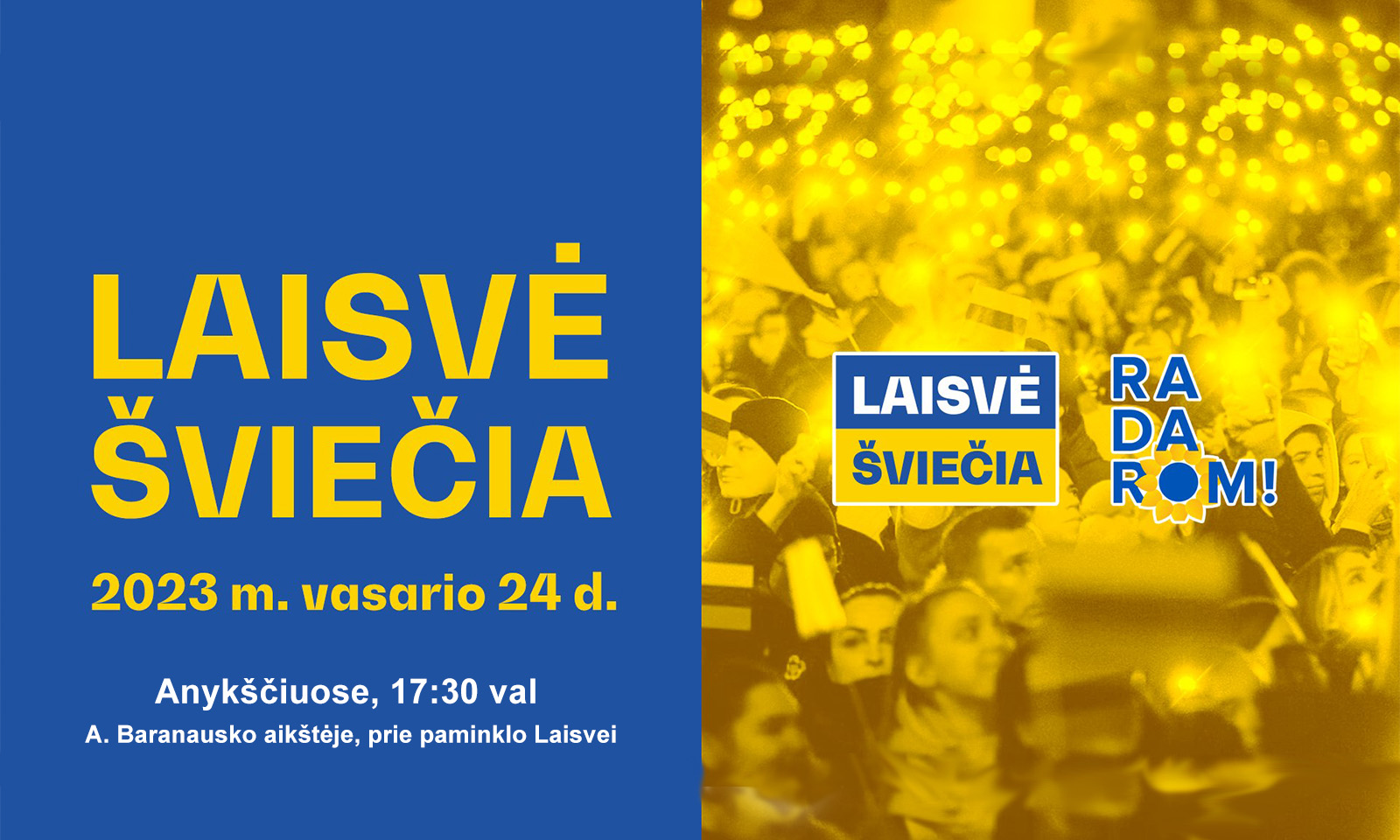 Vasario 24 d. penktadienį 17 val. 30 min., kviečiame susiburti į akciją „Laisvė šveičia“ ir miesto aikštėje prie paminklo Laisvei uždegti solidarumo žiburius bei aukoti trūkstamas lėšas anykštėnų gaminamoms žvakėms kovojančiai Ukrainai, taip pat ir „RaDarom“.