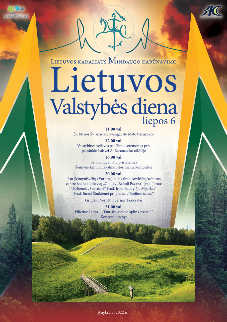Kviečiame prisijungti ir švęsti Mindaugo karūnavimo dieną kartu, tradiciškai iškeliant trispalvę A. Baranausko aikštėje, ant Šeimyniškėlių piliakalnio stebint Anykščių kultūros centro šokių kolektyvų pasirodymus, klausantis grupės „Nešpėtni bernai“ koncerto bei kartu sugiedant visų lietuvių širdis apjungsiančią Tautišką giesmę pilietinėje akcijoje „Tautiška giesmė aplink pasaulį“.