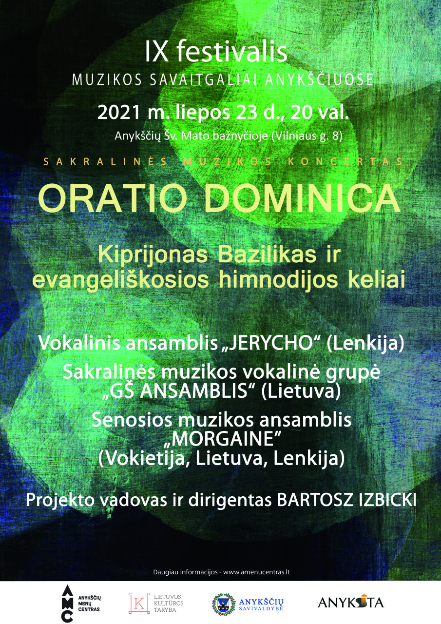 Anykščių miesto šventės metu, liepos 23 d., penktadienį, 20 val. kviečiame į IX-ojo festivalio „Muzikos savaitgaliai Anykščiuose“ trečiąjį koncertą Anykščių Šv. apaštalo evangelisto Mato bažnyčioje. Viešoji koncertinė įstaiga „Banchetto musicale“ pristatys naują ir unikalią sakralinės muzikos programą „Oratio Dominica: Kiprijonas Bazilikas ir evangeliškosios himnodijos keliai“.