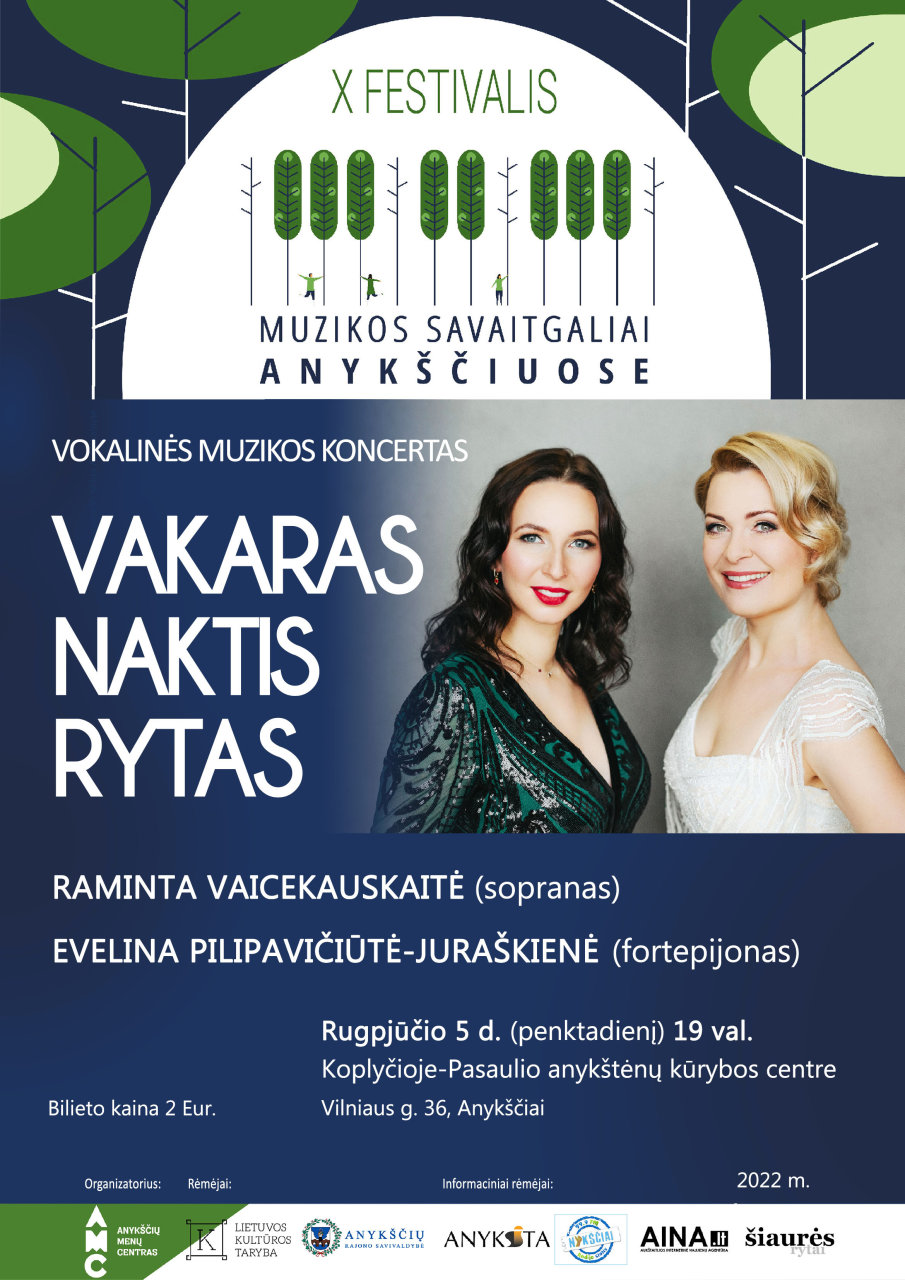 Rugpjūčio 5-ąją dieną, penktadienį, 19.00 val. Anykščių koplyčioje-Pasaulio anykštėnų kūrybos centre (Vilniaus g. 36) vyks X-ojo festivalio „Muzikos savaitgaliai Anykščiuose“ koncertas „VAKARAS NAKTIS RYTAS“, kurio metu girdėsite Ramintą Vaicekauskaitę (sopranas) ir Eveliną Pilipavičiūtę-Juraškienę (fortepijonas).