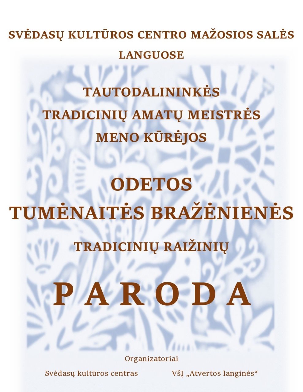 Svėdasų miestelyje kultūros centras ir VšĮ „Atvertos langinės" kviečia į Odetos Tumėnaitės Bražėnienės tradicinių raižinių parodą.