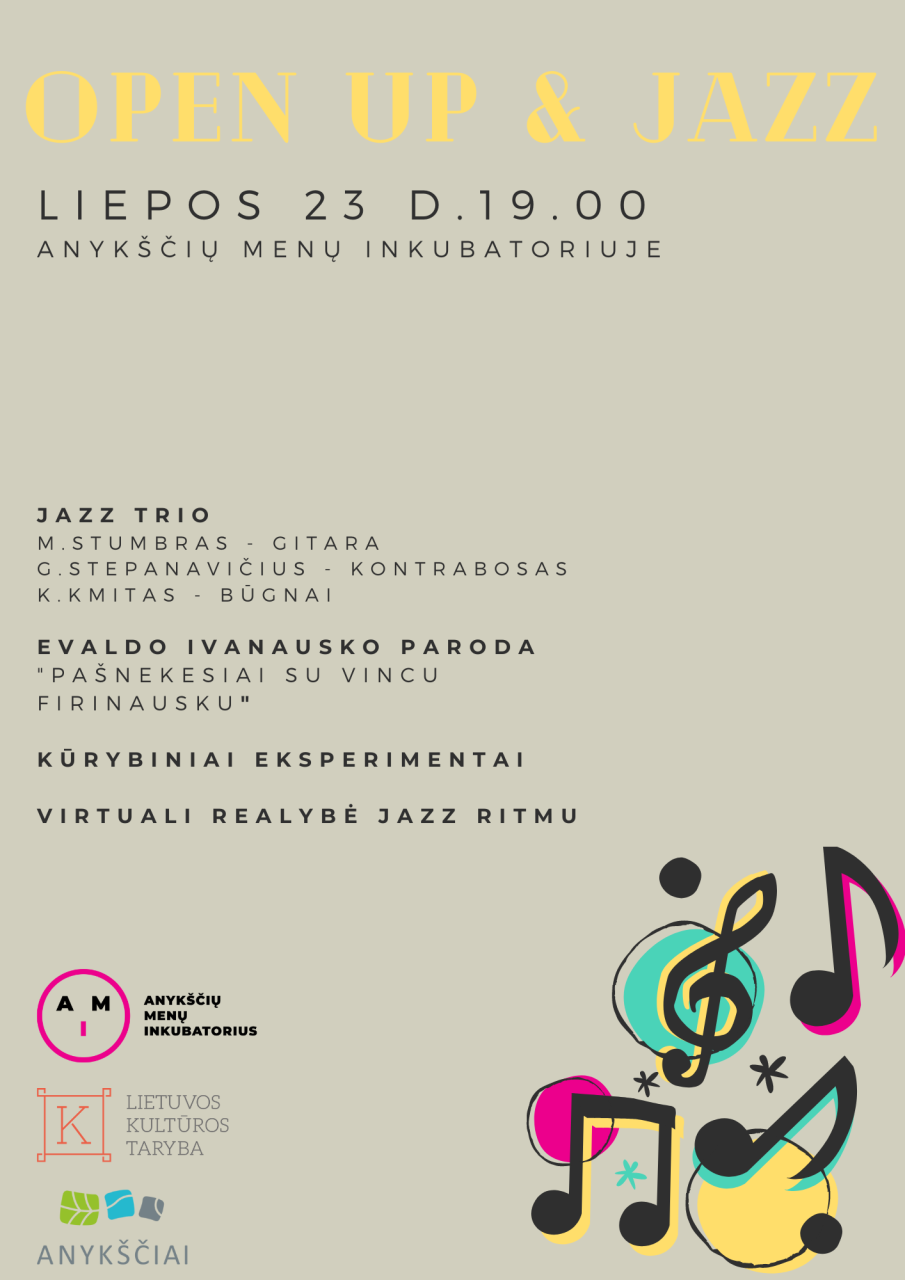 “Jazz Trio” – šis džiazo trio susibūrė specialiai šiai progai iš tarptautinėje scenoje patyrusių muzikų – gitaristo Mindaugo Stumbro, multiinstrumentalisto Gedimino Stepanavičiaus ir būgnininko Kristupo Kmito. Studijos Škotijoje, Olandijoje, meistriškumo pamokos, kūrybiniai projektai, džiazo, šiuolaikinės ir populiariosios muzikos festivaliai visoje Europoje subrandino šių atlikėjų individualius skambesius. Daugybė tarpdisciplininių meno renginių, multimedijos, bendradarbiavimas su teatralais, šokėjais, literatais ir kitų sričių menininkais praplėtė šių muzikų pajautą ir kūrybiškumą. Žinomų džiazo temų interpretacijos, originalios kompozicijos ir nuoširdžiai laisvos improvizacijos sukurs vienetinę atmosferą Anykščių Meno Inkubatoriuje jau šį penktadienį.
