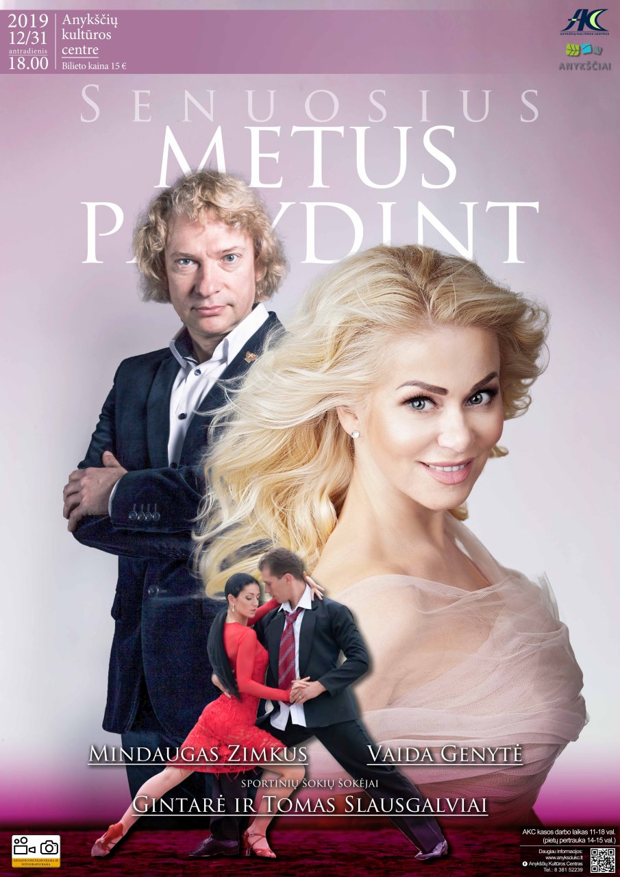 Gruodžio 31 d. 18 val. kviečiame į nuotaikingą naujametinį koncertą Anykščių kultūros centre. Dainuos Vaida Genytė, Mindaugas Zimkus, šoks profesionalūs sportinių šokių šokėjai Gintarė ir Tomas Slausgalviai.
