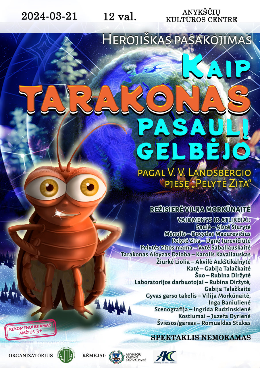 Kovo 21 d. 12 val. į spektaklį „Kaip tarakonas pasaulį gelbėjo” Anykščių kultūros centre. Spektaklis nemokamas, skirtas 3–12 metų vaikams.