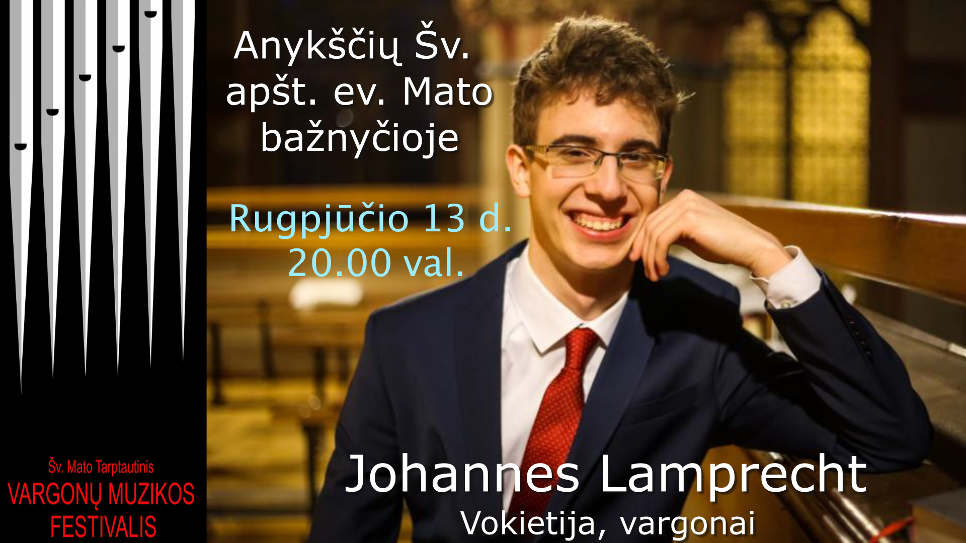 Rugpjūčio 13 d. 20.00 val. festivalyje svečiuosis vargonininkas iš Vokietijos Johannes Lamprecht. Anot atlikėjo, per pastaruosiuos metus jis itin pamėgo Johanno Sebastiano Bacho ir Olivierio Messiaeno, Johno Cage’o muziką vargonams. Tad ir koncerte keliausime nuo baroko garsinių perlų iki XX-XXI a. sandūros opusų.