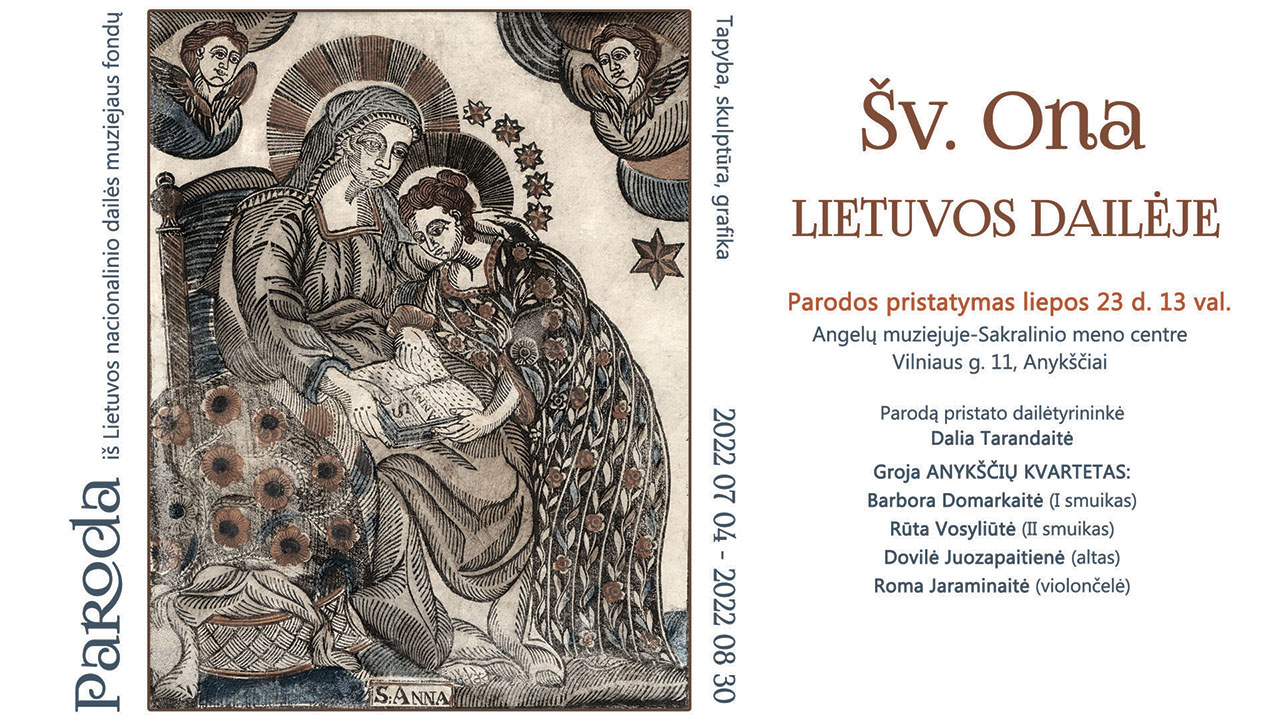 Angelų muziejuje-Sakralinio meno centre pradėta eksponuoti Lietuvos nacionalinės dailės galerijos fondų paroda „Šventa Ona Lietuvos dailėje“. Paroda veiks iki rugpjūčio 30 dienos.