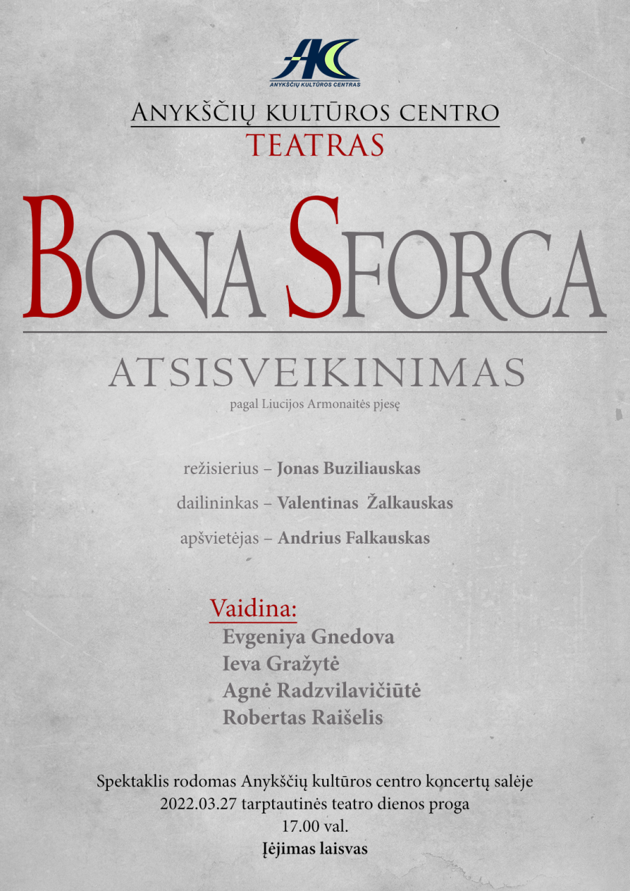 Spektaklio „Bona Sforca. Atsisveikinimas“ premjera įvyko 2021 m. gegužės mėn. Jis buvo suvaidintas netradicinėje erdvėje – kultūros centro rūsyje. Tai pasakojimas apie Žygimanto Augusto motiną italę Boną Sforcą, kuri visą savo gyvenimą paaukojusi vyrui, sūnui, valstybei, tapo visų užmiršta, išduota ir niekam nebereikalinga. Tai moters, valdovės, motinos tragedija. Spektaklis pastatytas remiantis Bonos ir jos amžininkų laiškais bei metraščiais.