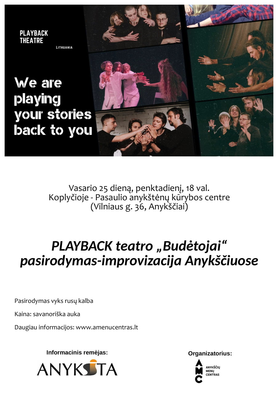 Playback teatro trupę „Вахтёры“ sudaro vaidybinio teatro metodu sertifikuoti aktoriai. Jų spektakliai yra visiška improvizacija, o žiūrovai nustato dramaturgiją. Žiūrovai pasakoja savo istorijas, o aktoriai jas iškart paverčia garso, kūno judesių, žodžių ir emocijų simbioze. Aktoriai nesitars ir nerepetuos. Jie iš karto parodys jūsų pasakotą istoriją, akompanuojant muzikantui. Kažkas sureaguos į jūsų istoriją ir norės papasakoti savo. Šis sakramentas tęsis iki spektaklio pabaigos.