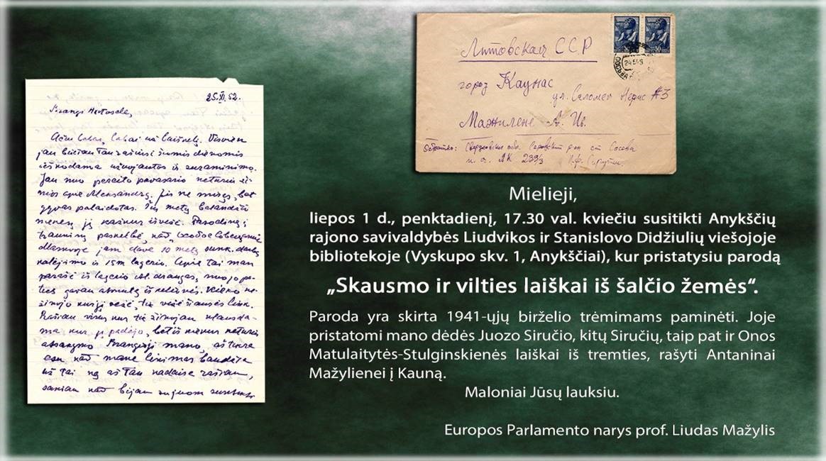 Liepos 1 d., penktadienį, 17.30 val. Anykščių rajono savivaldybės Liudvikos ir Stanislovo Didžiulių viešojoje bibliotekoje (Vyskupo skv. 1, Anykščiai) Europos Parlamento narys pristatys tremtinių laiškų parodą „Skausmo ir vilties laiškai iš šalčio žemės“. Paroda yra skirta masinėms sovietmečiu vykusioms deportacijoms atminti. Po renginio pristatymo susirinkusieji kviečiami diskusijai apie masinius trėmimus iš Lietuvos sovietmečiu ir dabartines politinės aktualijas Rusijos karo pieš Ukrainą kontekste.