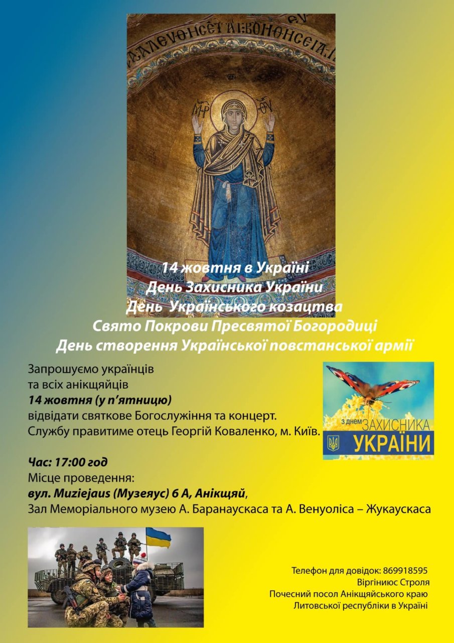 Spalio 14 d. 17 val. A. Baranausko ir A. Vienuolio ir A. Vienuolio-Žukausko memorialinio muziejaus salėje ir socialiniame tinkle FACEBOOK tiesiogiai transliuosime ukrainiečių bendruomenėms rengiamas Ukrainos gynėjų dienos ir Pokrova (Dievo Motinos globos šventė) iškilmes bei Tėvo Georgijaus Kovalenkos (Kijevo Sofijos soboras) aukojamas Šv. Mišias.