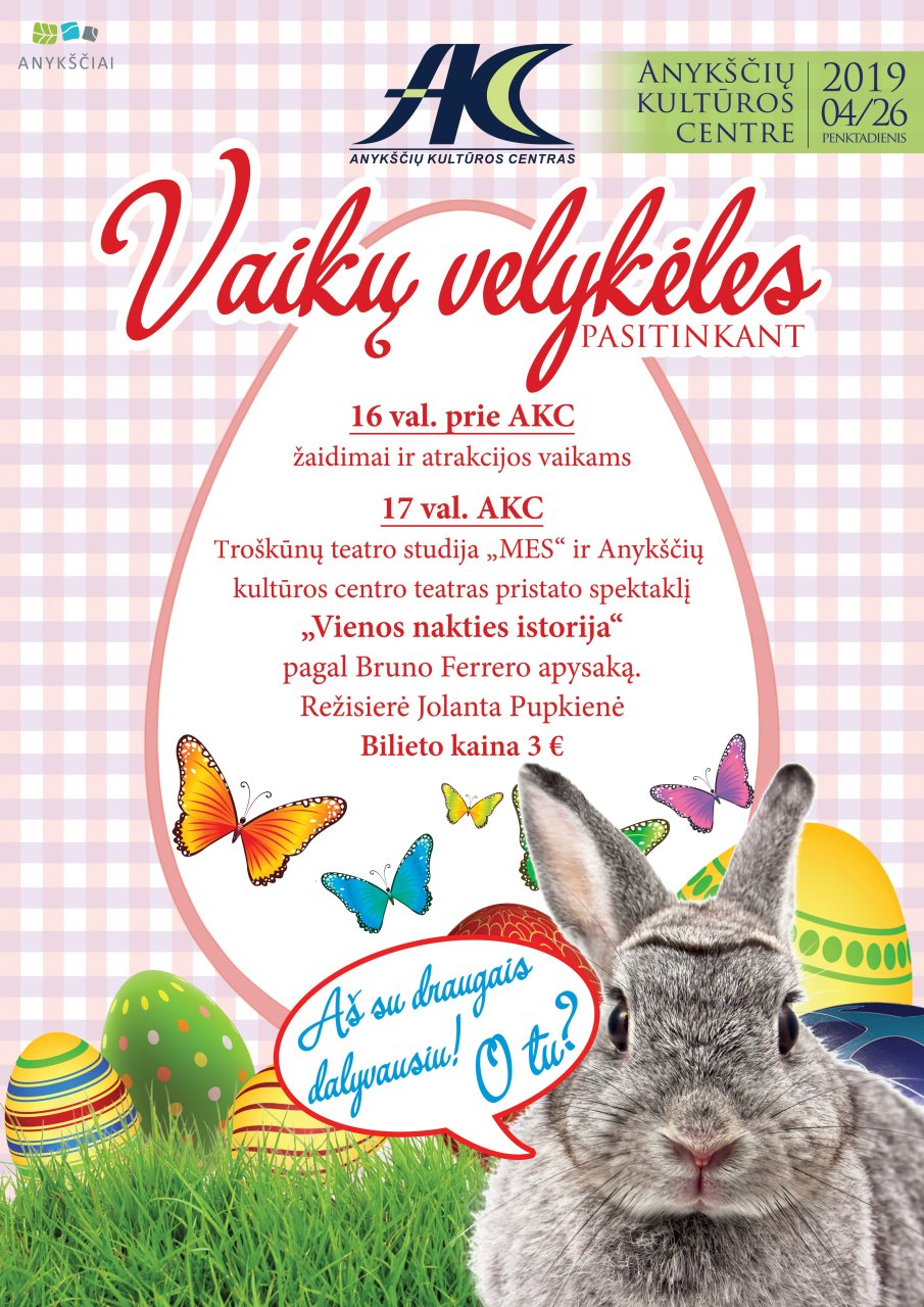Vaikų Velykėles pasitinkant: Žaidimai ir atrakcijos vaikams; Spektaklis „VIENOS NAKTIES ISTORIJA“